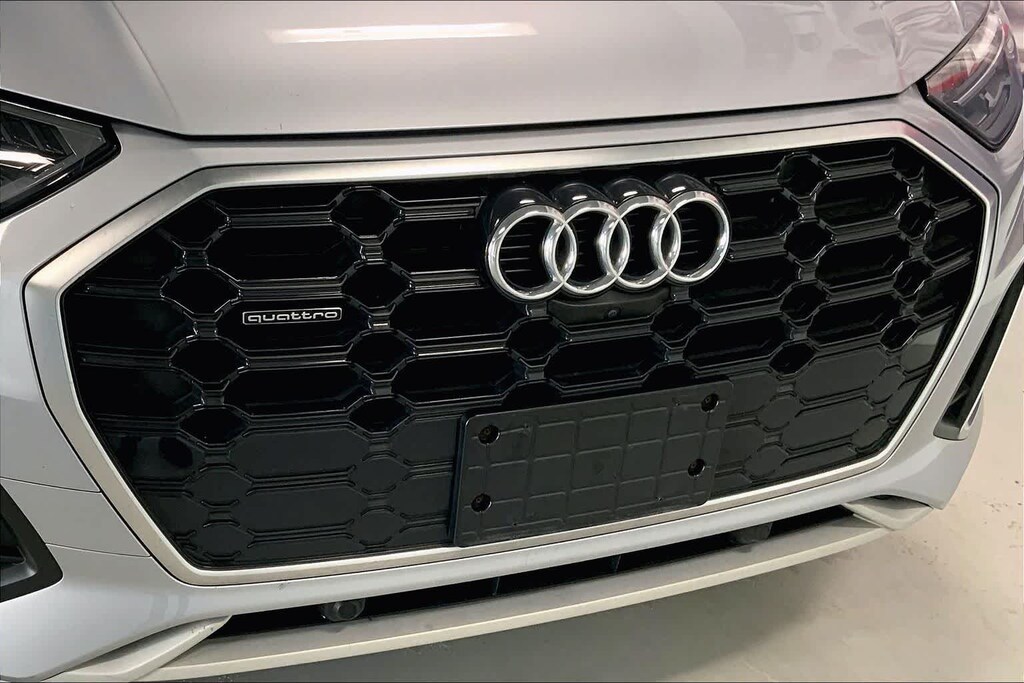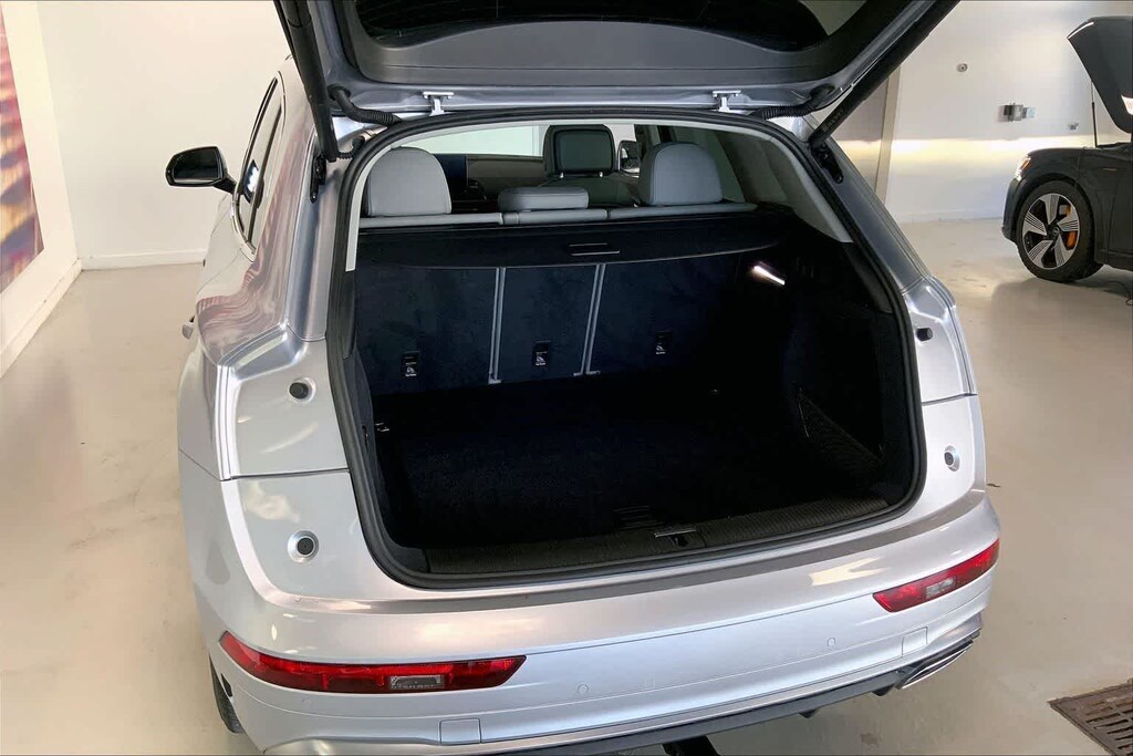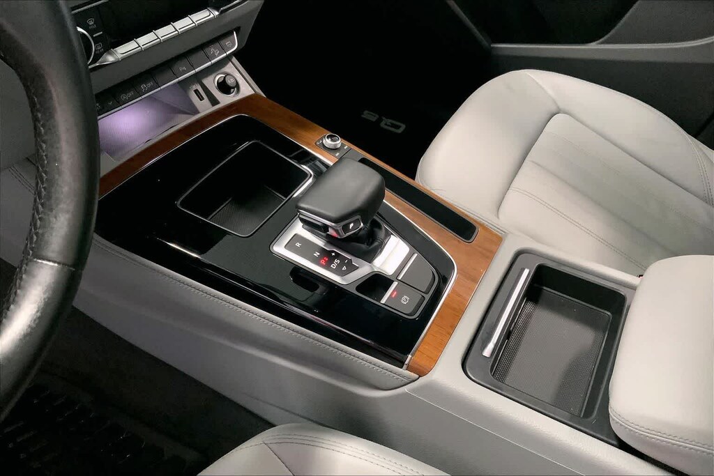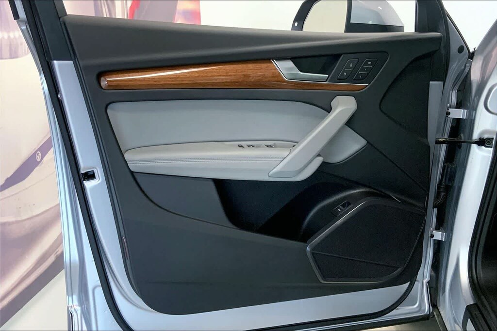 Q5 45 S line Premium Plus is nicely equipped with Gray Leather, ABS brakes, Alloy wheels, Compass, Electronic Stability Control, Front dual zone A/C, Heated door mirrors, Heated front seats, Illuminated entry, Low tire pressure warning, Power Liftgate, Remote keyless entry, Traction control, 10 Speakers, 4-Wheel Disc Brakes, 5.302 Axle Ratio, Air Conditioning, AM/FM radio, Auto High-beam Headlights, Auto-dimming Rear-View mirror, Automatic temperature control, Brake assist, Bumpers: body-color, Delay-off headlights, Driver door bin, Driver vanity mirror, Dual front impact airbags, Dual front side impact airbags, Emergency communication system: Audi connect CARE, Exterior Parking Camera Rear, Four wheel independent suspension, Front anti-roll bar, Front Bucket Seats, Front Center Armrest, Front fog lights, Front reading lights, Garage door transmitter: HomeLink, Genuine wood console insert, Genuine wood dashboard insert, Genuine wood door panel insert, Heated 8-Way Power Front Bucket Seats, Leather Seating Surfaces, Leather Shift Knob, Occupant sensing airbag, Outside temperature display, Overhead airbag, Overhead console, Panic alarm, Passenger door bin, Passenger vanity mirror, Power door mirrors, Power driver seat, Power passenger seat, Power steering, Power windows, Radio data system, Radio: Audi Sound System, Rain sensing wipers, Rear air conditioning, Rear anti-roll bar, Rear fog lights, Rear reading lights, Rear seat center armrest, Rear window defroster, Rear window wiper, Roof rack, Security system, Speed control, Speed-sensing steering, Speed-Sensitive Wipers, Split folding rear seat, Spoiler, Steering wheel mounted audio controls, Tachometer, Telescoping steering wheel, Tilt steering wheel, Trip computer, Turn signal indicator mirrors, Variably intermittent wipers, and Wheels: 18 5-Arm-Star Design.