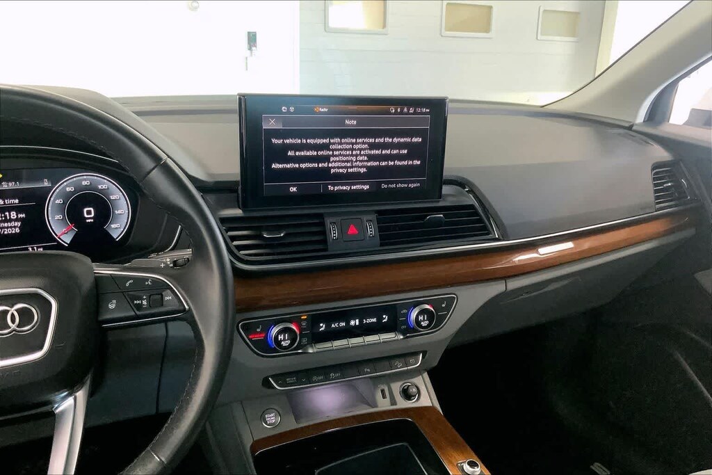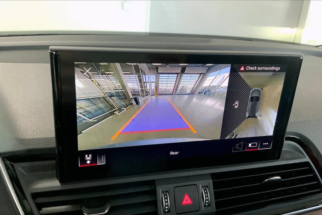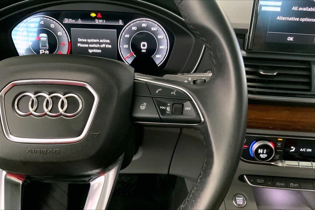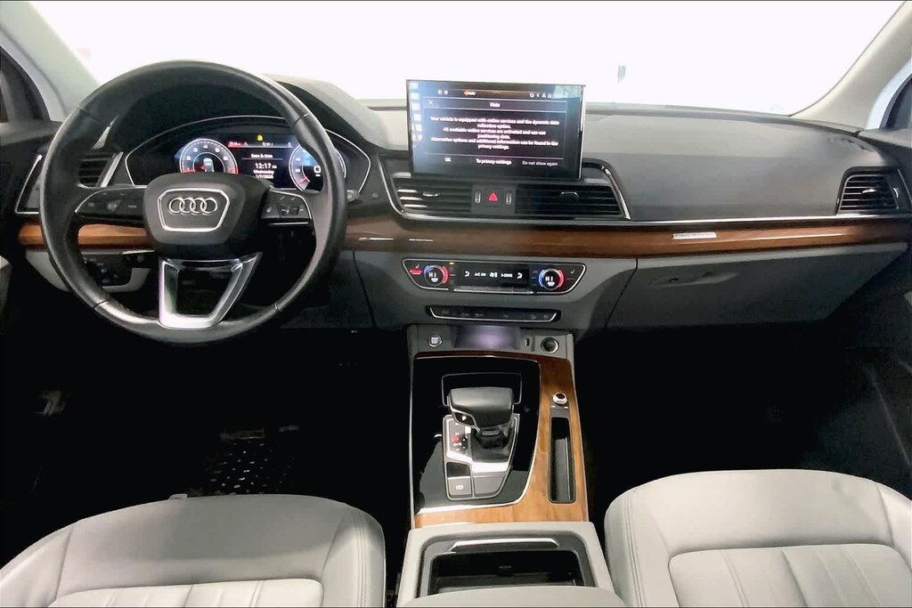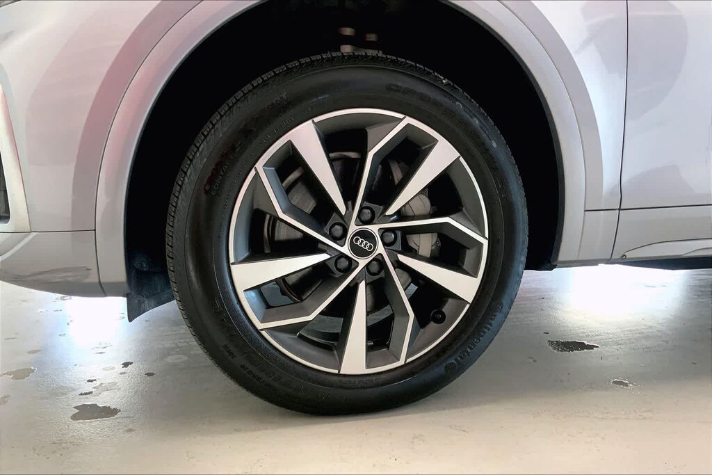 Q5 45 S line Premium Plus is nicely equipped with Gray Leather, ABS brakes, Alloy wheels, Compass, Electronic Stability Control, Front dual zone A/C, Heated door mirrors, Heated front seats, Illuminated entry, Low tire pressure warning, Power Liftgate, Remote keyless entry, Traction control, 10 Speakers, 4-Wheel Disc Brakes, 5.302 Axle Ratio, Air Conditioning, AM/FM radio, Auto High-beam Headlights, Auto-dimming Rear-View mirror, Automatic temperature control, Brake assist, Bumpers: body-color, Delay-off headlights, Driver door bin, Driver vanity mirror, Dual front impact airbags, Dual front side impact airbags, Emergency communication system: Audi connect CARE, Exterior Parking Camera Rear, Four wheel independent suspension, Front anti-roll bar, Front Bucket Seats, Front Center Armrest, Front fog lights, Front reading lights, Garage door transmitter: HomeLink, Genuine wood console insert, Genuine wood dashboard insert, Genuine wood door panel insert, Heated 8-Way Power Front Bucket Seats, Leather Seating Surfaces, Leather Shift Knob, Occupant sensing airbag, Outside temperature display, Overhead airbag, Overhead console, Panic alarm, Passenger door bin, Passenger vanity mirror, Power door mirrors, Power driver seat, Power passenger seat, Power steering, Power windows, Radio data system, Radio: Audi Sound System, Rain sensing wipers, Rear air conditioning, Rear anti-roll bar, Rear fog lights, Rear reading lights, Rear seat center armrest, Rear window defroster, Rear window wiper, Roof rack, Security system, Speed control, Speed-sensing steering, Speed-Sensitive Wipers, Split folding rear seat, Spoiler, Steering wheel mounted audio controls, Tachometer, Telescoping steering wheel, Tilt steering wheel, Trip computer, Turn signal indicator mirrors, Variably intermittent wipers, and Wheels: 18 5-Arm-Star Design.