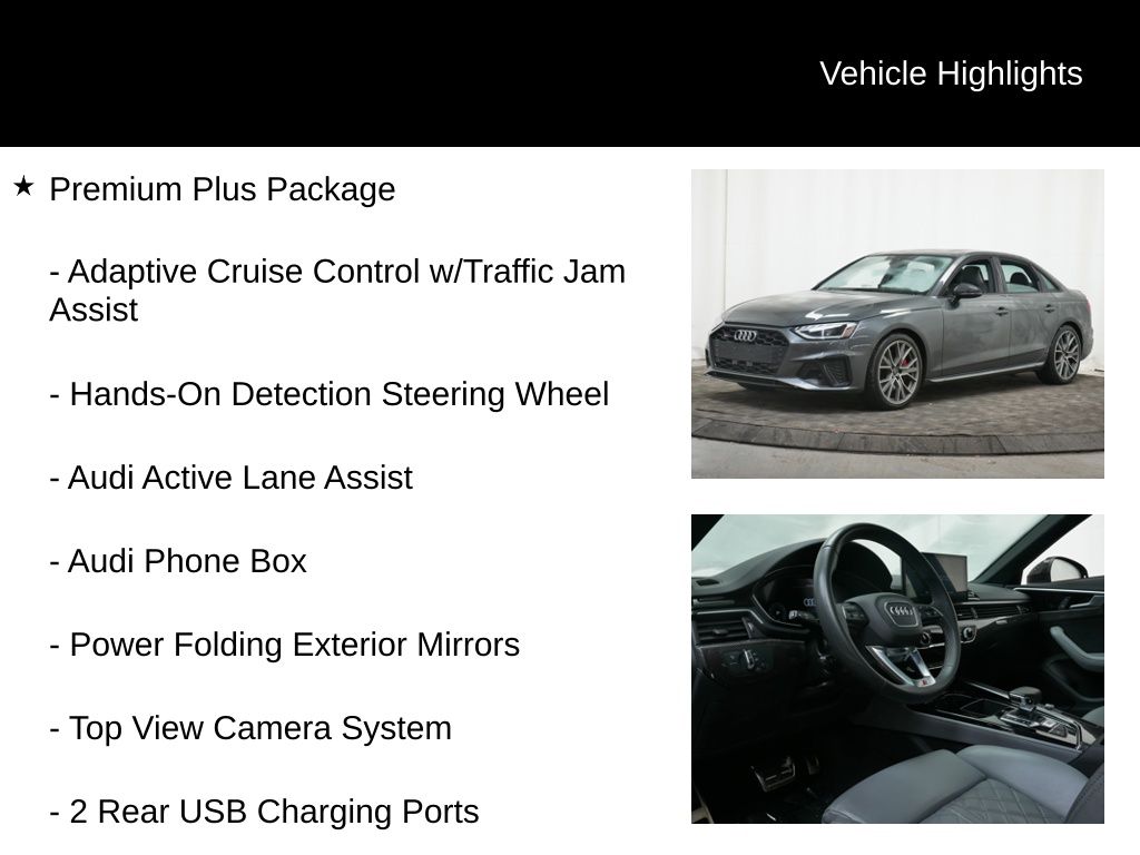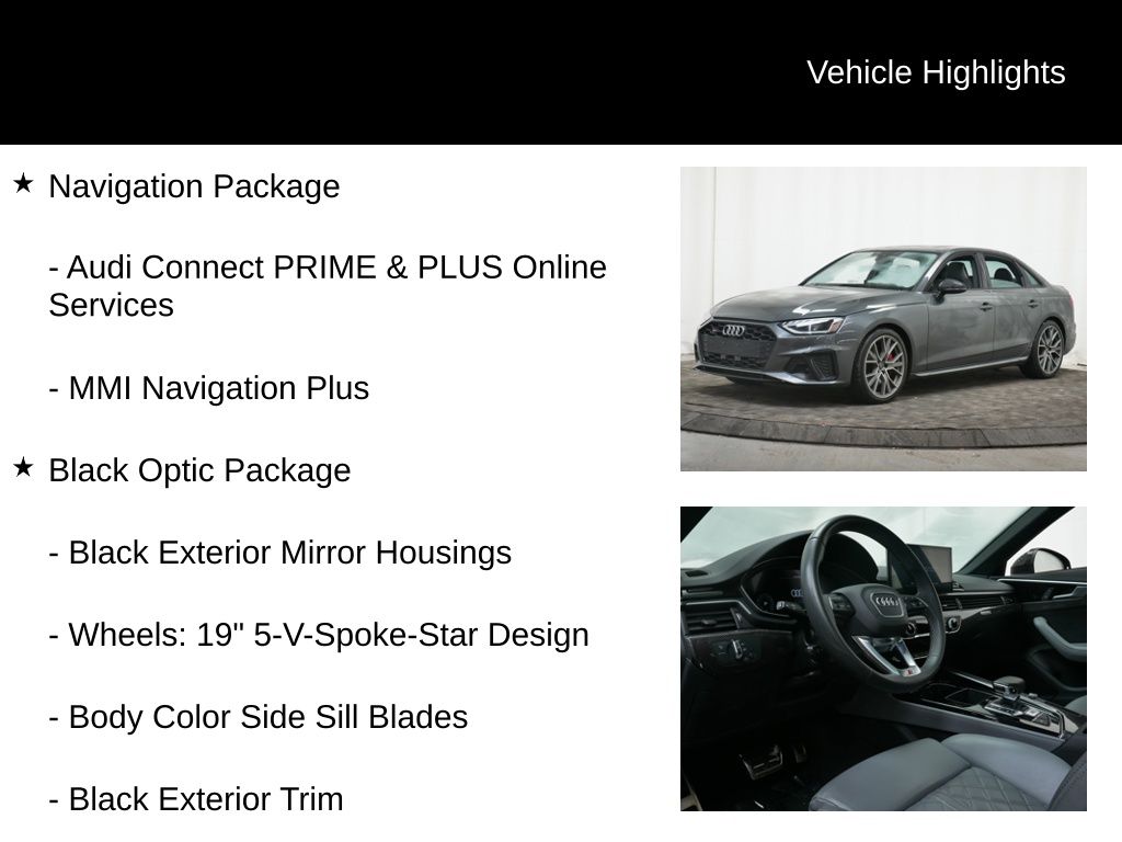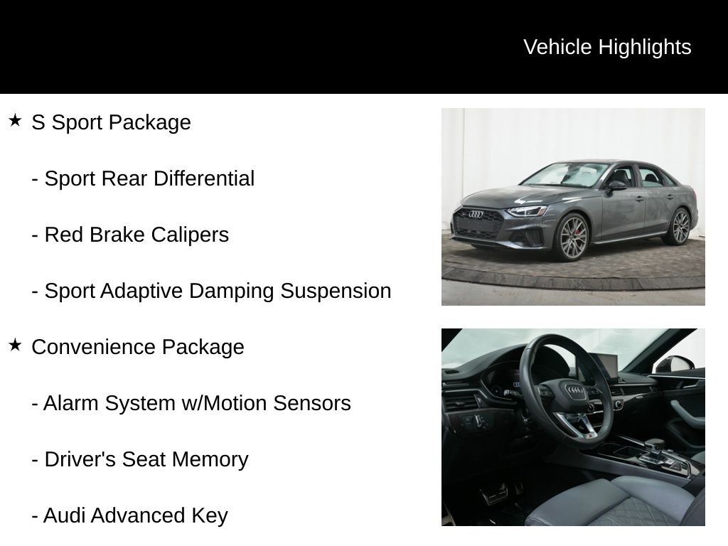 This S4 is powered by a robust 3.0L TFSI engine, delivering an impressive 349 horsepower and 369 lb-ft of torque. Paired with an 8-speed automatic transmission and Audi's renowned quattro all-wheel-drive system, this vehicle offers exceptional performance and handling, with an EPA-estimated 21 mpg in the city and 30 mpg on the highway.