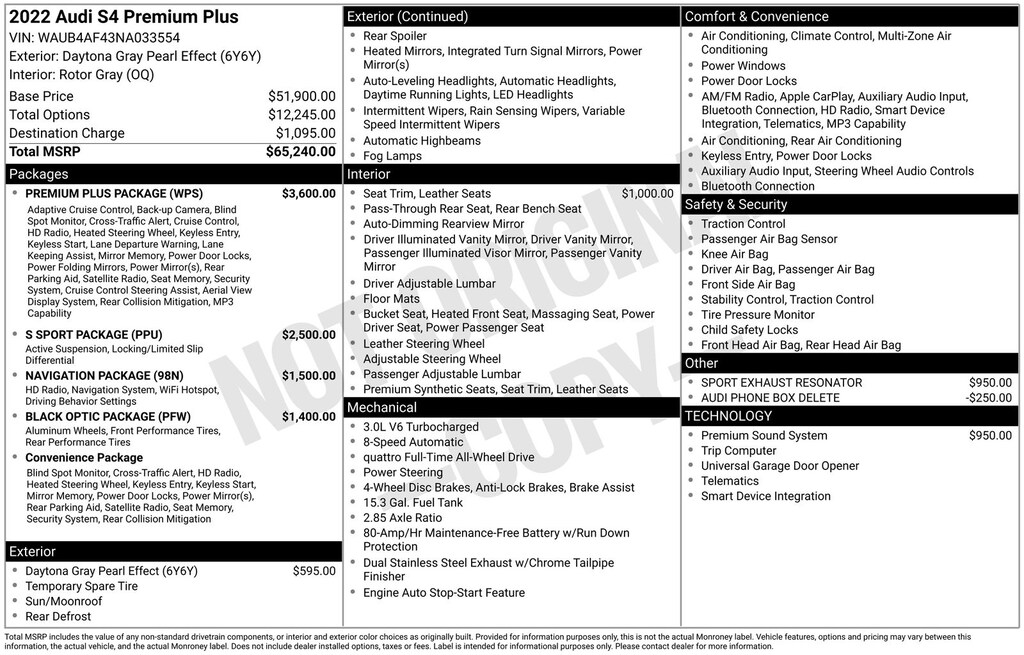 The Premium Plus package elevates the driving experience with a host of advanced features, including the Audi Virtual Cockpit Plus, Audi Connect PRIME & PLUS Online Services, and a top-of-the-line Bang & Olufsen sound system. The S Sport package further enhances the driving dynamics with sport-tuned suspension, a sport rear differential, and red brake calipers.