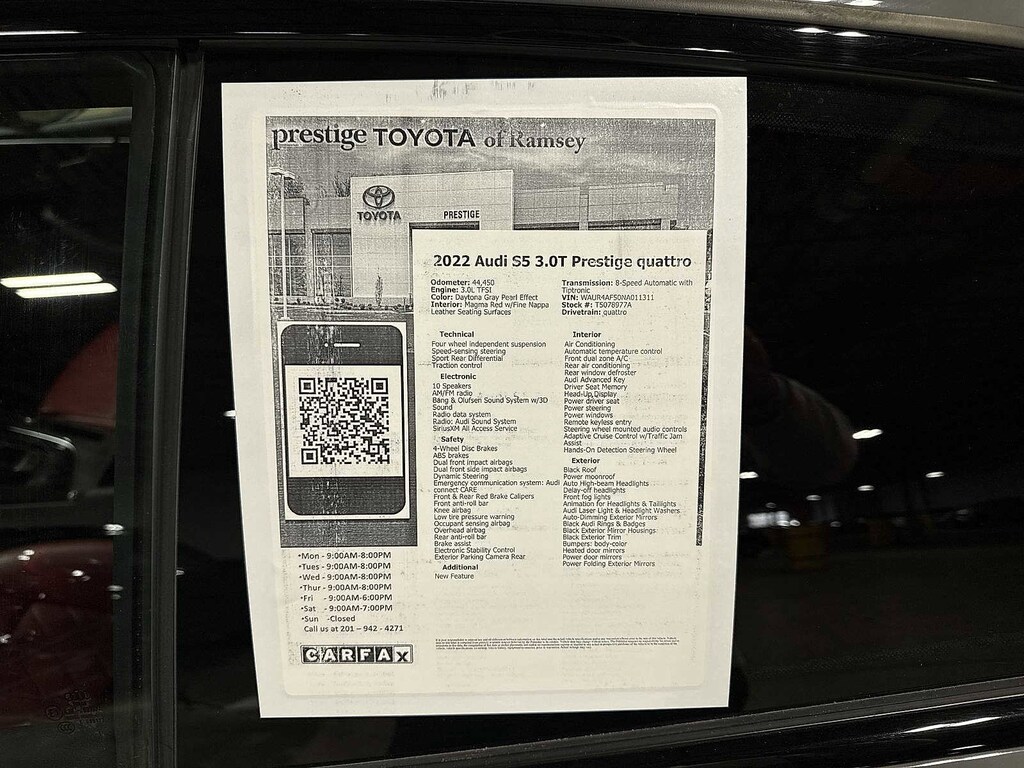 S5 3.0T Prestige quattro, 2D Coupe, 3.0L TFSI, 8-Speed Automatic with Tiptronic, quattro, Daytona Gray Pearl Effect, Magma Red w/Fine Nappa Leather Seating Surfaces, Adaptive Cruise Control w/Traffic Jam Assist, Alarm System w/Motion Sensors, Animation for Headlights & Taillights, Audi Active Lane Assist, Audi Advanced Key, Audi Laser Light & Headlight Washers, Audi Phone Box, Audi Side Assist w/Pre Sense Rear, Audi Virtual Cockpit Plus, Auto-Dimming Exterior Mirrors, Bang & Olufsen Sound System w/3D Sound, Black Exterior Mirror Housings, Black Exterior Trim, Black Optic Package, Convenience Package, Driver Seat Memory, Front & Rear Red Brake Calipers, Hands-On Detection Steering Wheel, Head-Up Display, Heated Steering Wheel, Interior Lighting Plus Package, Leatherette Covered Center Console & Door Armrests, MMI Navigation Plus, Navigation Package, Park Assist, Parking System Plus (Front/Rear Acoustic Sensors), Power Folding Exterior Mirrors, Prestige, S Sport Package, SiriusXM All Access Service, Sport Adaptive Damping Suspension, Sport Rear Differential, Top View Camera System, Traffic Sign Recognition, Wheels: 20 5-Twin-Spoke Polygon Design. Clean CARFAX. Daytona Gray Pearl Effect 2022 Audi S5 3.0T Prestige quattro quattro 8-Speed Automatic with Tiptronic 3.0L TFSI