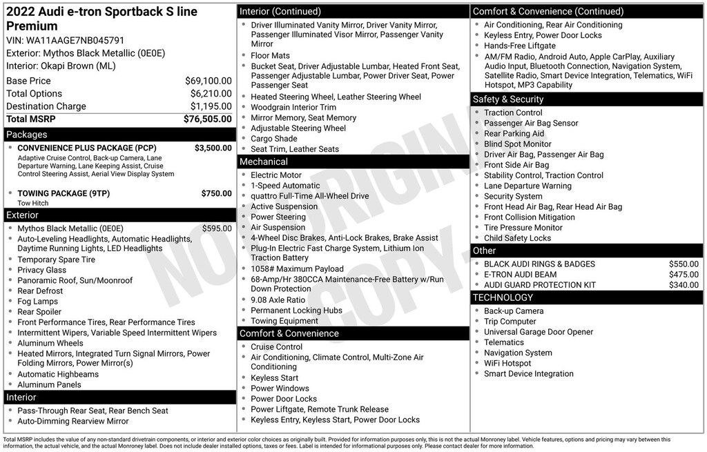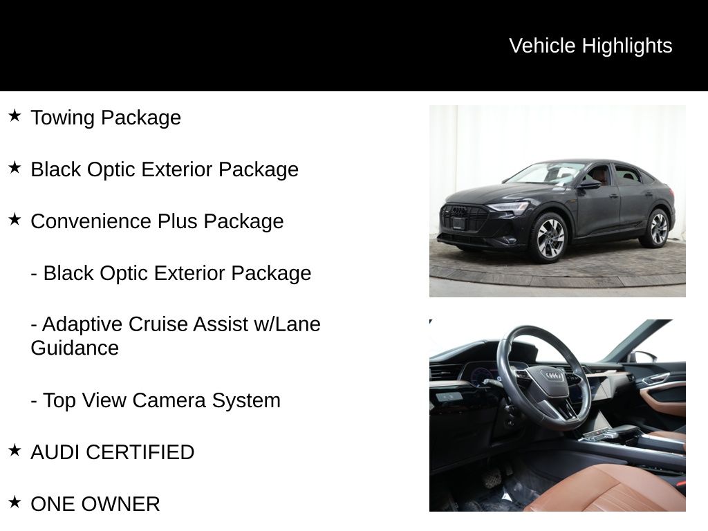 The Convenience Plus Package adds even more premium features, including Adaptive Cruise Assist with Lane Guidance, a Top View Camera System, and the Black Optic Exterior Package for a bold, sporty look. The Towing Package provides up to 4,000 lbs of towing capacity, making this e-tron Sportback a truly versatile electric vehicle.