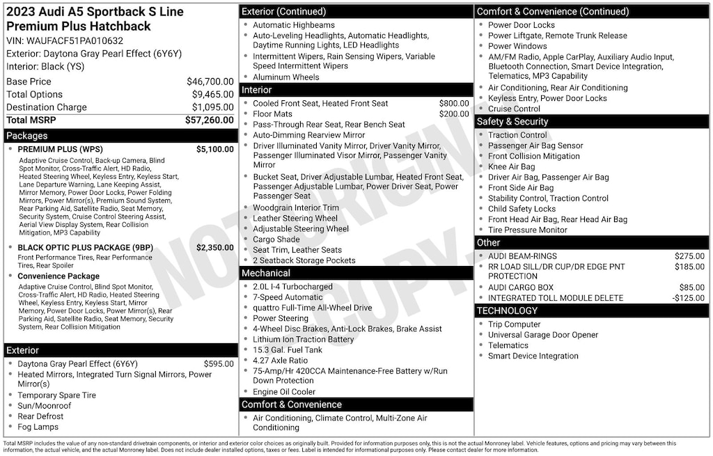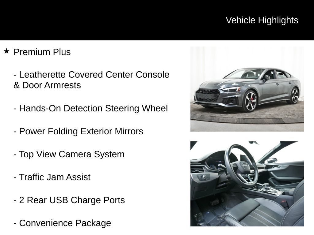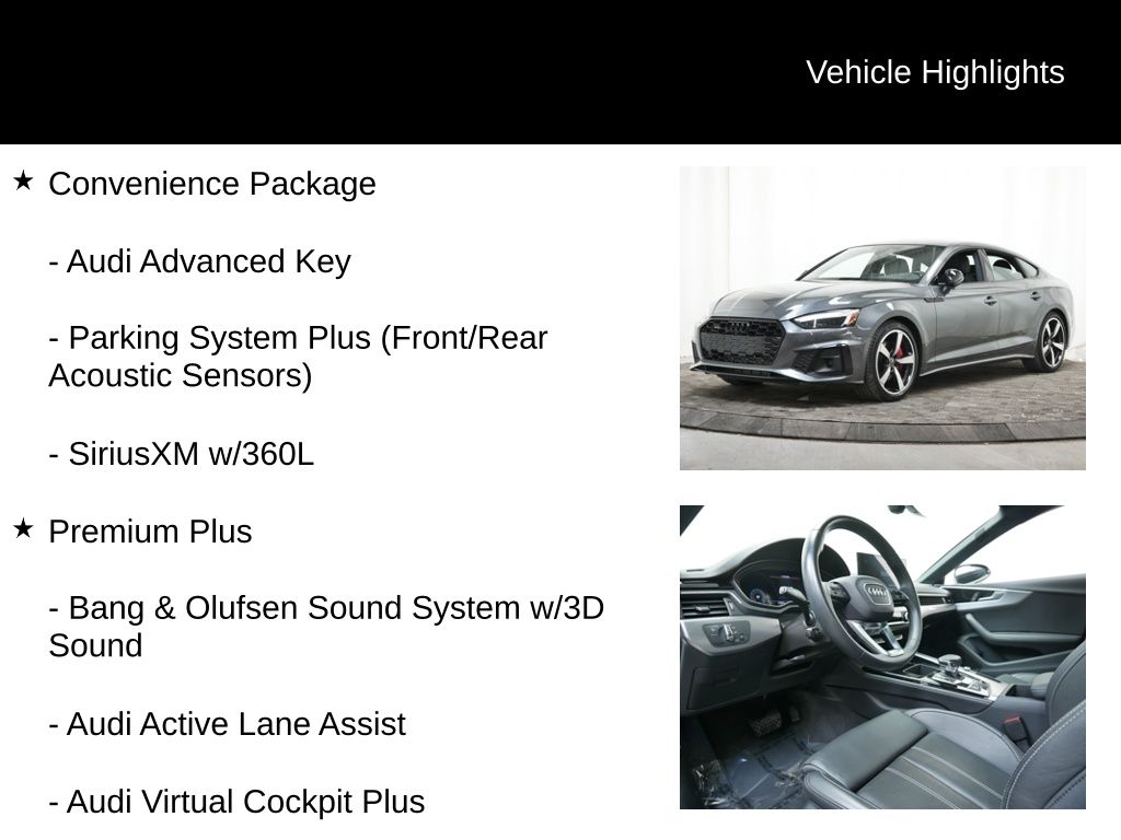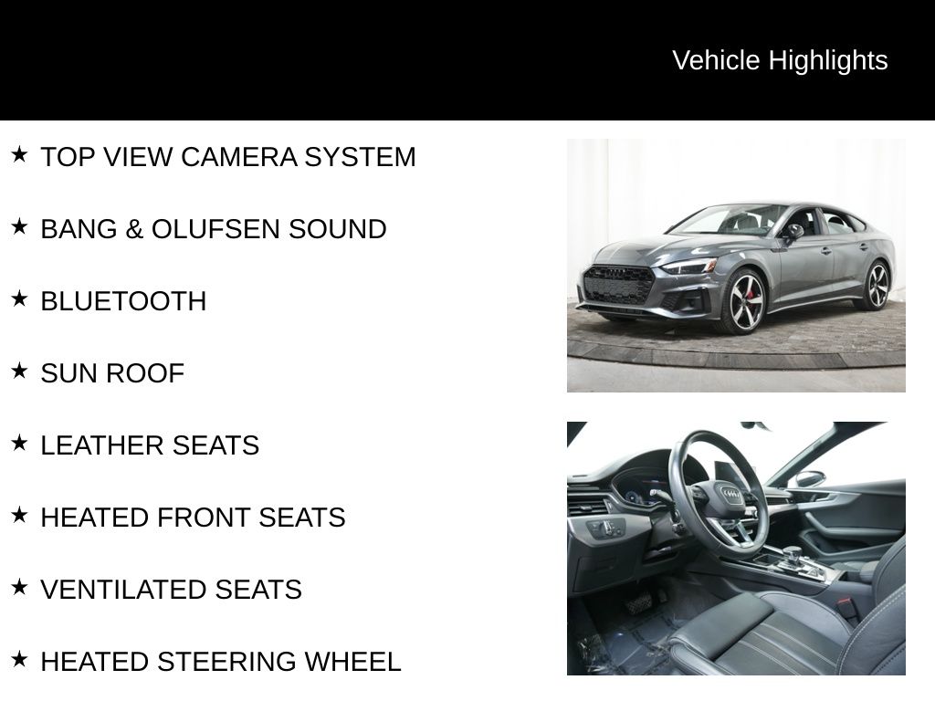 Don't miss the opportunity to experience the exceptional craftsmanship and cutting-edge technology of this 2023 Audi A5 Sportback. Schedule a test drive today and discover the joy of driving this remarkable vehicle.