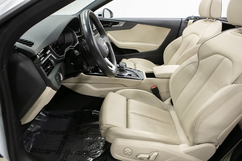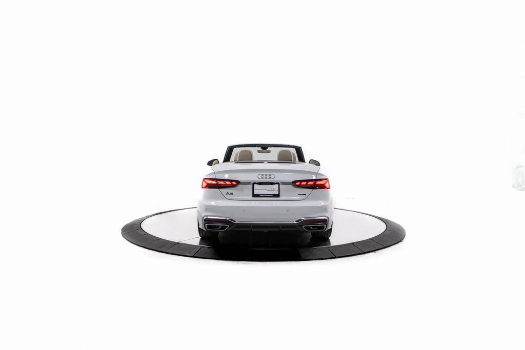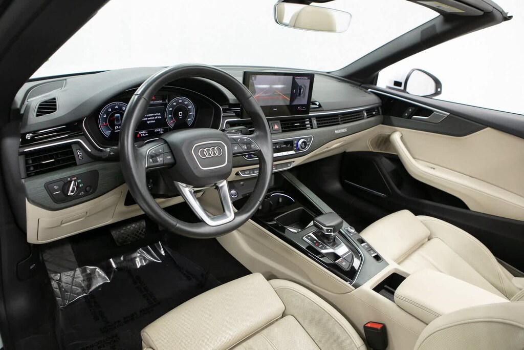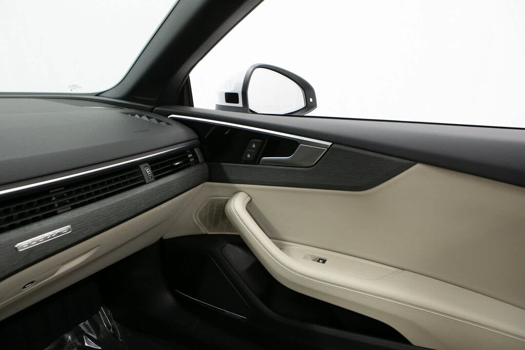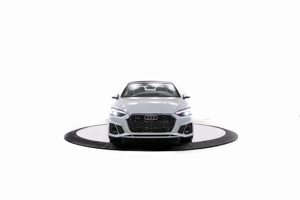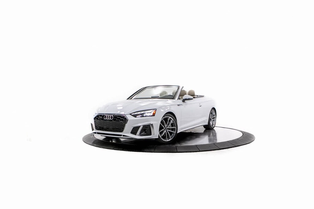 CARFAX One-Owner. Clean CARFAX. quattro, Atlas Beige Leather, 10 Speakers, 4-Wheel Disc Brakes, ABS brakes, Air Conditioning, Alloy wheels, AM/FM radio, Anti-whiplash front head restraints, Audi Beam-Rings, Audi Virtual Cockpit Plus, Auto High-beam Headlights, Auto-dimming Rear-View mirror, Automatic temperature control, Bang & Olufsen Sound System w/3D Sound, Brake assist, Bumpers: body-color, Compass, Convertible roof lining, Convertible roof wind blocker, Delay-off headlights, Driver door bin, Driver vanity mirror, Dual front impact airbags, Dual front side impact airbags, Electronic Stability Control, Emergency communication system: Audi connect CARE, Exterior Parking Camera Rear, Four wheel independent suspension, Front anti-roll bar, Front Bucket Seats, Front Center Armrest, Front dual zone A/C, Front fog lights, Front reading lights, Garage door transmitter: HomeLink, Genuine wood console insert, Genuine wood dashboard insert, Genuine wood door panel insert, Glass rear window, Hands-On Detection Steering Wheel, Heated door mirrors, Heated front seats, Heated Front Sport Seats, Illuminated entry, Integrated roll-over protection, Knee airbag, Leather Seating Surfaces, Leather Shift Knob, Leather steering wheel, Leatherette Covered Center Console & Door Armrests, Low tire pressure warning, Neck-Level Heating System, Occupant sensing airbag, Outside temperature display, Panic alarm, Passenger door bin, Passenger vanity mirror, Power adjustable front head restraints, Power convertible roof, Power door mirrors, Power driver seat, Power Folding Exterior Mirrors, Power passenger seat, Power steering, Power windows, Premium Plus, Radio data system, Radio: Audi Sound System, Rain sensing wipers, Rear air conditioning, Rear anti-roll bar, Rear reading lights, Rear window defroster, Remote keyless entry, Speed control, Speed-sensing steering, Speed-Sensitive Wipers, Split folding rear seat, Steering wheel mounted audio controls, Tachometer, Telescoping steering wheel, Tilt steering wheel, Top View Camera System, Traction control, Traffic Jam Assist, Trip computer, Turn signal indicator mirrors, Variably intermittent wipers, Warm Weather Package, Wheels: 18 5-Double-Spoke Design, Wheels: 19 5-Spoke-Cavo Design Bi-Color Finish, quattro, Atlas Beige Leather. Odometer is 13792 miles below market average! Glacier White Metallic/Black Roof 2023 Audi A5 45 S line Premium Plus quattro 45 S line Premium Plus quattro quattro 7-Speed Automatic S tronic 2.0L 4-Cylinder TFSI