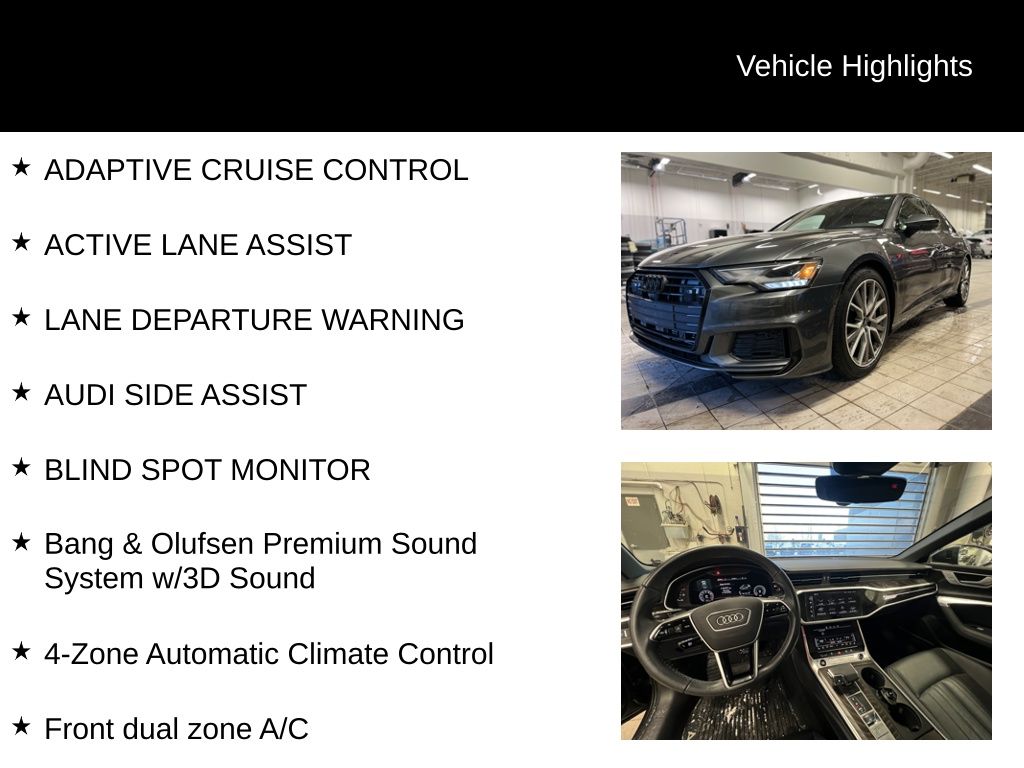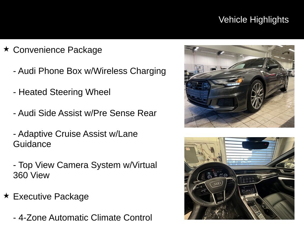 The Premium Plus package elevates the A6 with a host of premium features, including Matrix-Design LED headlights, Adaptive Cruise Assist with Lane Guidance, a Heated Steering Wheel, Audi Side Assist with Pre Sense Rear, and the stunning Bang & Olufsen Premium Sound System with 3D Sound. The Executive Package adds even more luxury, including Ventilated Front Seats, Heated Rear Seats, and a Multicolor Contour/Ambient LED Interior Lighting Package.