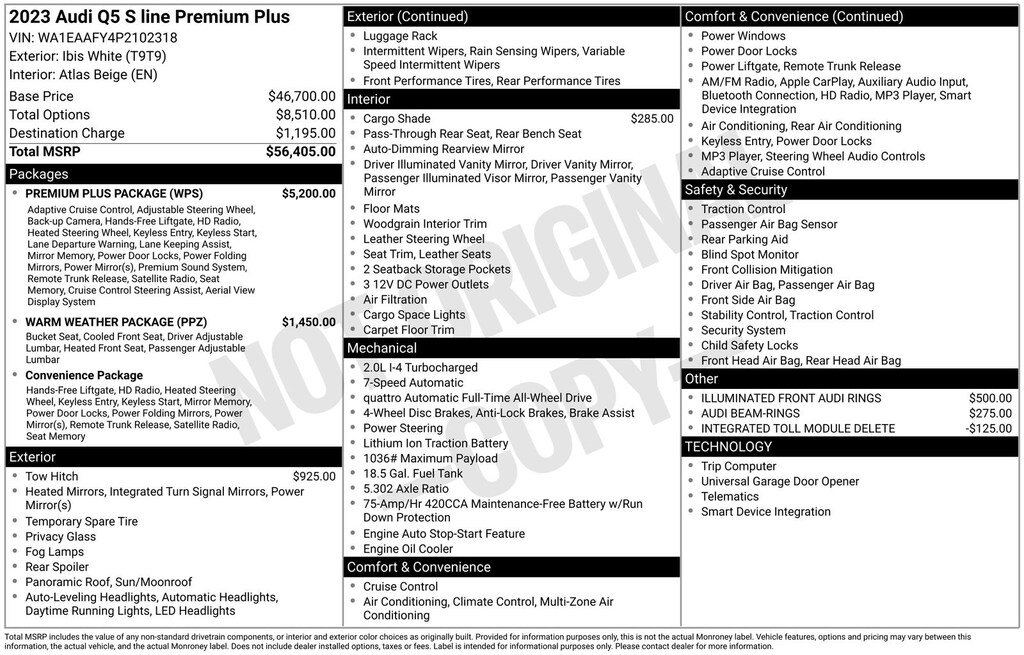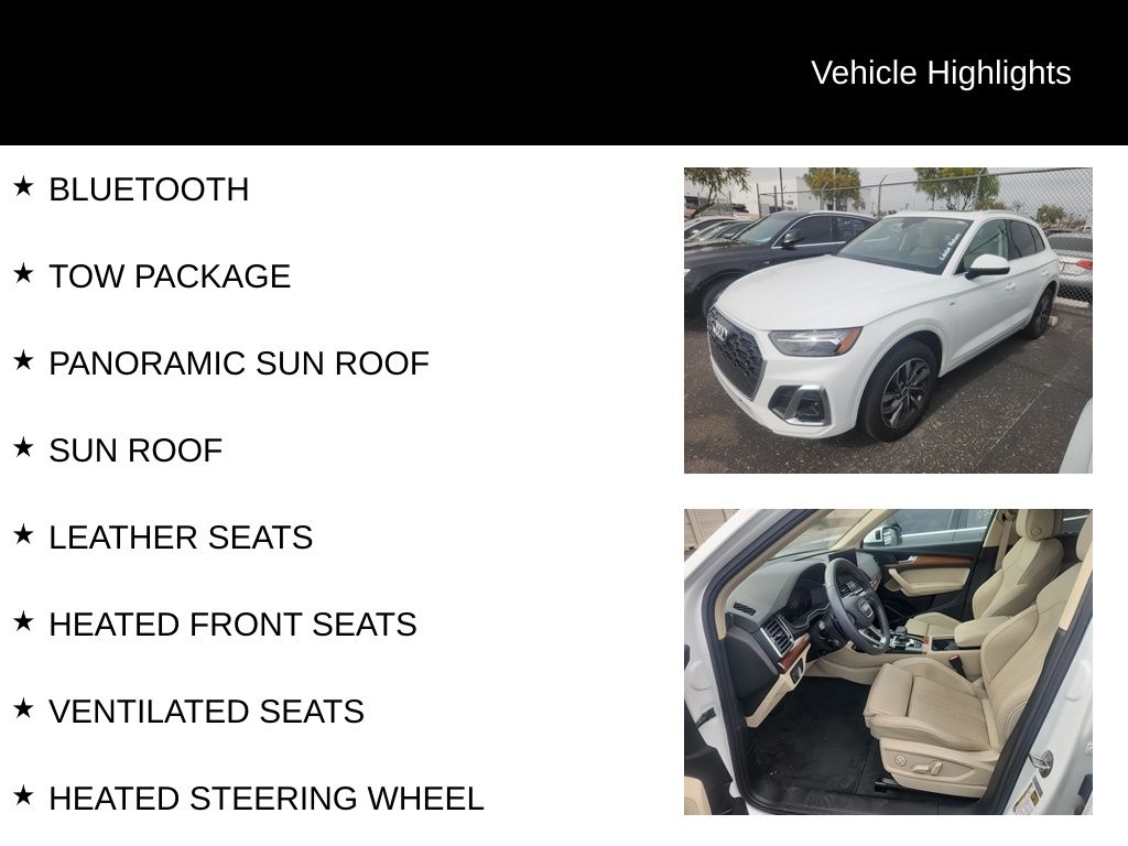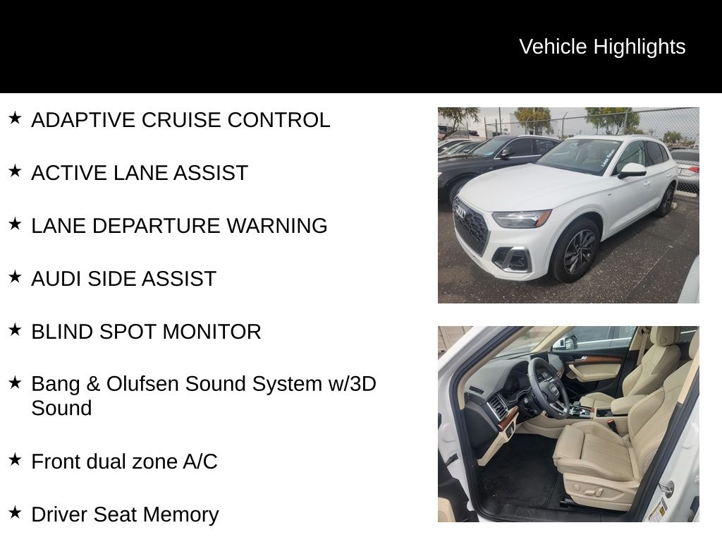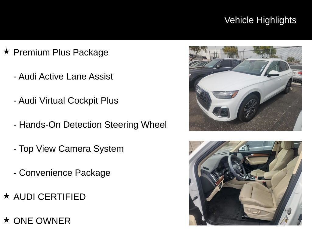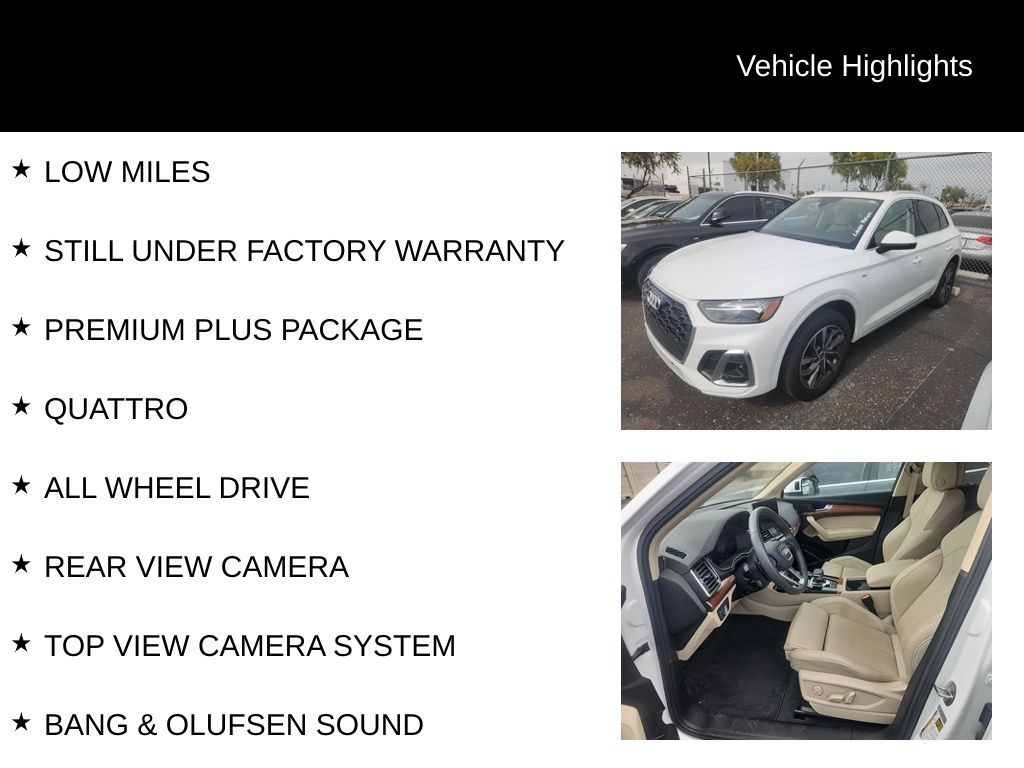 Certified. CARFAX One-Owner. Clean CARFAX. AUDI CERTIFIED, ONE OWNER, CLEAN CARFAX, LOW MILES, STILL UNDER FACTORY WARRANTY, PREMIUM PLUS PACKAGE, QUATTRO, ALL WHEEL DRIVE, REAR VIEW CAMERA, TOP VIEW CAMERA SYSTEM, BANG & OLUFSEN SOUND, BLUETOOTH, TOW PACKAGE, PANORAMIC SUN ROOF, SUN ROOF, LEATHER SEATS, HEATED FRONT SEATS, VENTILATED SEATS, HEATED STEERING WHEEL, ADAPTIVE CRUISE CONTROL, ACTIVE LANE ASSIST, LANE DEPARTURE WARNING, AUDI SIDE ASSIST, BLIND SPOT MONITOR, Atlas Beige w/Leather Seating Surfaces, ABS brakes, Alloy wheels, Audi Active Lane Assist, Audi Advanced Key, Audi Virtual Cockpit Plus, Bang & Olufsen Sound System w/3D Sound, Compass, Convenience Package, Driver Seat Memory, Electronic Stability Control, Front dual zone A/C, Hands-On Detection Steering Wheel, Heated door mirrors, Heated front seats, Heated Steering Wheel, Illuminated entry, Leatherette Covered Center Console & Door Armrests, Low tire pressure warning, Manual Rear Side Window Sunshades, Panoramic Sunroof, Power Adjustable Steering Column, Power Liftgate, Premium Plus Package, Remote keyless entry, Top View Camera System, Traction control, Traffic Jam Assist, Trailer Hitch, Ventilated Front Sport Seats w/4-Way Power Lumbar, Warm Weather Package, Wheels: 19" 5-Double-Arm Design Bi-Color Finish.