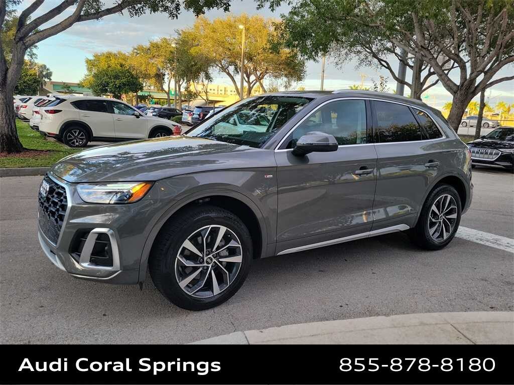 Certified. 2023 Audi Q5 45 S line Premium Plus quattro Q5 45 S line Premium Plus quattro, Chronos Gray Metallic, Black w/Leather Seating Surfaces, ABS brakes, Alloy wheels, Audi Active Lane Assist, Audi Connect PLUS, Audi Virtual Cockpit Plus, BANG & OLUFSEN SOUND SYSTEM W/3D SOUND, Compass, Convenience Package, Electronic Stability Control, Front dual zone A/C, Hands-On Detection Steering Wheel, Heated door mirrors, Heated front seats, Illuminated entry, Leatherette Covered Center Console & Door Armrests, Low tire pressure warning, MMI Navigation Plus, NAVIGATION WITH AUDI VIRTUAL COCKPIT, Panoramic Sunroof, Power Adjustable Steering Column, Power Liftgate, Premium Plus Package, Remote keyless entry, Top View Camera System, Traction control, Traffic Jam Assist, Wheels: 19 5-Double-Arm Design Bi-Color Finish.