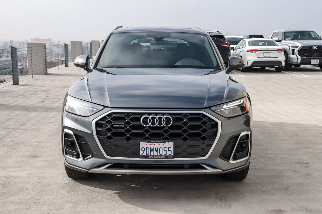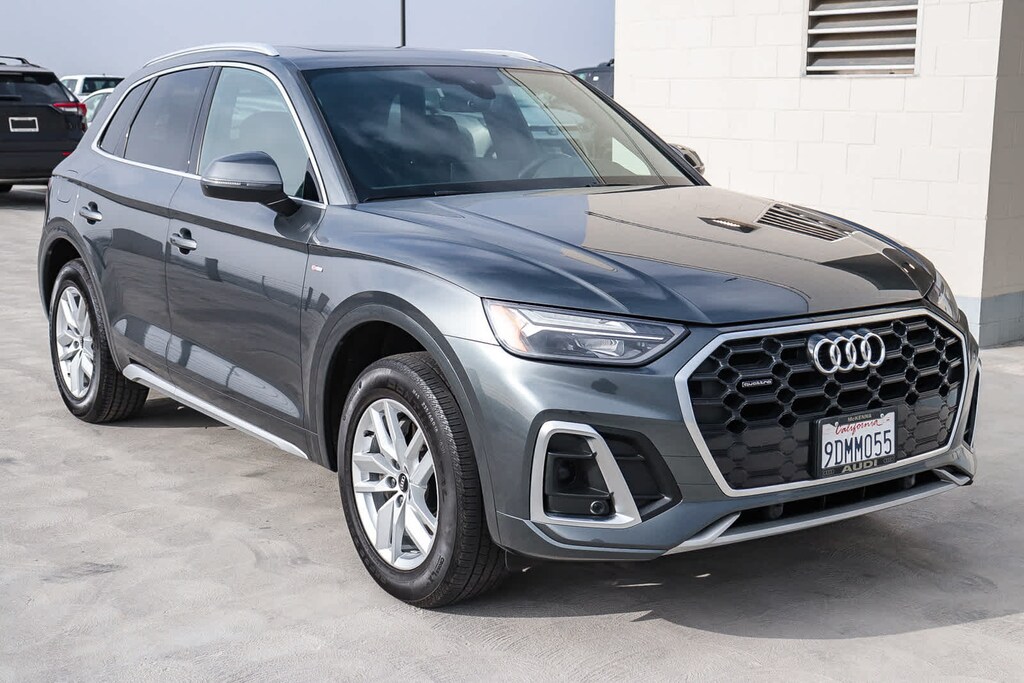 MULTI POINT SAFETY AND MECHANICAL INSPECTION PERFORMED BY CERTIFIED TECHNICIAN, PERFORMED SERVICE, INTERIOR and EXTERIOR DETAILED FOR DELIVERY, 10 Speakers, 4-Wheel Disc Brakes, 5.302 Axle Ratio, ABS brakes, Air Conditioning, Alloy wheels, AM/FM radio, Audi Advanced Key, Audi Beam-Rings, Audi Guard All-Weather Floor Mats (Set of 4), Auto-Dimming Power Folding Exterior Mirrors, Auto-dimming Rear-View mirror, Automatic temperature control, Brake assist, Bumpers: body-color, Compass, Convenience Package, Delay-off headlights, Driver door bin, Driver Seat Memory, Driver vanity mirror, Dual front impact airbags, Dual front side impact airbags, Electronic Stability Control, Emergency communication system: Audi connect CARE, Exterior Parking Camera Rear, Four wheel independent suspension, Front anti-roll bar, Front Bucket Seats, Front Center Armrest, Front dual zone A/C, Front fog lights, Front reading lights, Garage door transmitter: HomeLink, Genuine wood console insert, Genuine wood dashboard insert, Genuine wood door panel insert, Gray-Brown Birch Natural Wood Inlays, Heated 8-Way Power Front Bucket Seats, Heated door mirrors, Heated front seats, Heated Steering Wheel, Illuminated entry, Integrated Toll Module Delete (DISC), Leather Seating Surfaces, Leather Shift Knob, Low tire pressure warning, Occupant sensing airbag, Outside temperature display, Overhead airbag, Overhead console, Panic alarm, Panoramic Sunroof, Passenger door bin, Passenger vanity mirror, Power door mirrors, Power driver seat, Power Liftgate, Power passenger seat, Power steering, Power windows, Privacy Trunk Cover, Radio data system, Radio: Audi Sound System, Rain sensing wipers, Rear air conditioning, Rear anti-roll bar, Rear fog lights, Rear reading lights, Rear seat center armrest, Rear window defroster, Rear window wiper, Remote keyless entry, Roof rack, Security system, SiriusXM w/360L, Speed control, Speed-sensing steering, Speed-Sensitive Wipers, Split folding rear seat, Spoiler, Steering wheel mounted audio controls, Tachometer, Telescoping steering wheel, Tilt steering wheel, Traction control, Trip computer, Turn signal indicator mirrors, Variably intermittent wipers, Wheels: 18 5-Arm-Turbine Design. Daytona Gray Pearl 2023 Audi Q5 45 S line Premium quattro quattro 7-Speed Automatic S tronic 2.0L Turbocharged