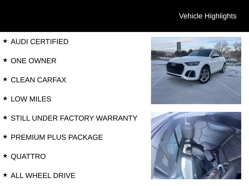 As an Audi Certified pre-owned vehicle, this Q5 e has undergone a rigorous 125+ point inspection and comes with a comprehensive warranty, roadside assistance, and a clean CARFAX report. You can drive with confidence, knowing that this Audi has been meticulously maintained and is ready to provide you with years of exceptional performance and enjoyment.