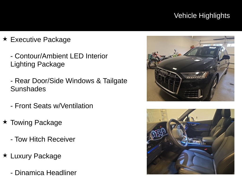 Elevating your driving experience, this Q7 is equipped with a wealth of premium features, including the Prestige Package that adds a Bang & Olufsen premium sound system, head-up display, heated steering wheel, and more. The Luxury Package further enhances the cabin with ventilated and massaging front seats, a Dinamica headliner, and premium leather upholstery.