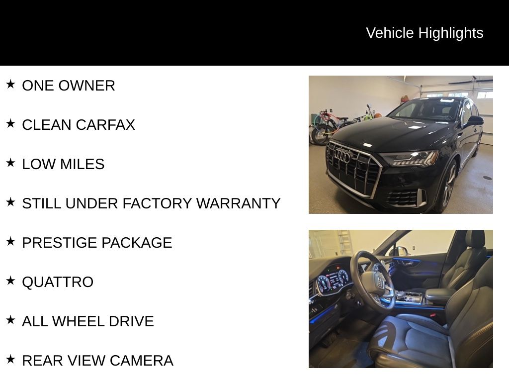 This 2023 Audi Q7 55 Prestige quattro is a remarkable SUV that combines exceptional performance, advanced technology, and uncompromising luxury. Boasting a powerful 3.0L TFSI engine, this Q7 delivers a thrilling driving experience with its responsive 8-speed automatic transmission and renowned Audi quattro all-wheel drive system.