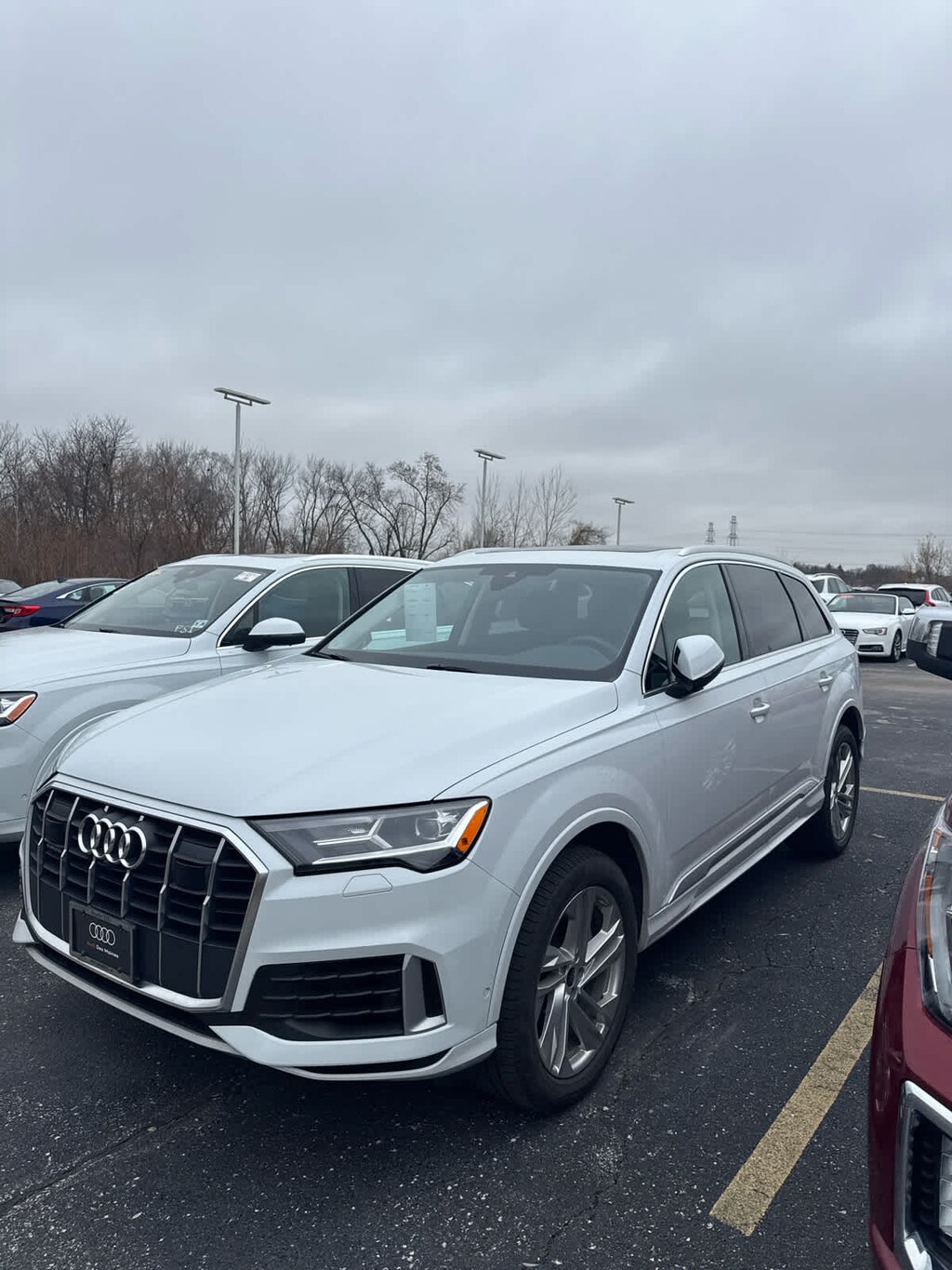 Q7 55 Premium Plus is nicely equipped with Contour/Ambient LED Interior Lighting Package, Convenience Package (Adaptive Cruise Assist w/Lane Guidance, Audi Phone Box w/Wireless Charging, Heated Steering Wheel, and Topview Camera System), Executive Package (4-Zone Automatic Climate Control, Front Seats w/Ventilation, Heated Rear Seats, and Rear Door/Side Windows & Tailgate Sunshades), Premium Plus Package (Bang & Olufsen Premium Sound System w/3D Sound, Illuminated Door Sills, and Wheels: 20 5-Spoke Turbine-Design), Towing Package (Tow Hitch Receiver), 10 Speakers, 3.204 Axle Ratio, 3rd row seats: bench, 4-Wheel Disc Brakes, ABS brakes, Air Conditioning, Alloy wheels, AM/FM radio: SiriusXM w/ 360L, Audi Beam Rings, Audi Guard Protection Kit, Auto High-beam Headlights, Auto-dimming door mirrors, Auto-dimming Rear-View mirror, Automatic temperature control, Brake assist, Bumpers: body-color, Compass, Delay-off headlights, Driver door bin, Driver vanity mirror, Dual front impact airbags, Dual front side impact airbags, Electronic Stability Control, Emergency communication system: Audi connect CARE, Exterior Parking Camera Rear, Four wheel independent suspension, Front anti-roll bar, Front Bucket Seats, Front Center Armrest, Front dual zone A/C, Front fog lights, Front reading lights, Fully automatic headlights, Garage door transmitter: HomeLink, Genuine wood door panel insert, Heated door mirrors, Heated Front Bucket Seats, Heated front seats, Illuminated entry, Integrated Toll Module Credit (DISC), Leather Seating Surfaces, Leather Shift Knob, Leather steering wheel, Low tire pressure warning, Matrix Design Headlights Credit (DISC), Memory seat, Navigation system: Audi MMI Navigation plus with Touch Response, Occupant sensing airbag, Outside temperature display, Overhead airbag, Overhead console, Panic alarm, Passenger door bin, Passenger vanity mirror, Power door mirrors, Power driver seat, Power Liftgate, Power moonroof: Panoramic, Power passenger seat, Power steering, Power windows, Privacy Trunk Cover, Radio data system, Radio: Audi Sound System, Rain sensing wipers, Rear air conditioning, Rear anti-roll bar, Rear fog lights, Rear reading lights, Rear seat center armrest, Rear side impact airbag, Rear window defroster, Rear window wiper, Reclining 3rd row seat, Remote keyless entry, Roof rack: rails only, Rr Load Sill/Dr Cup/Dr Edge Pnt Protection (DISC), Security system, Speed control, Speed-sensing steering, Split folding rear seat, Spoiler, Steering wheel memory, Steering wheel mounted audio controls, Tachometer, Telescoping steering wheel, Tilt steering wheel, Traction control, Trip computer, Turn signal indicator mirrors, Variably intermittent wipers, and Wheels: 19 5-Arm-Star Design.