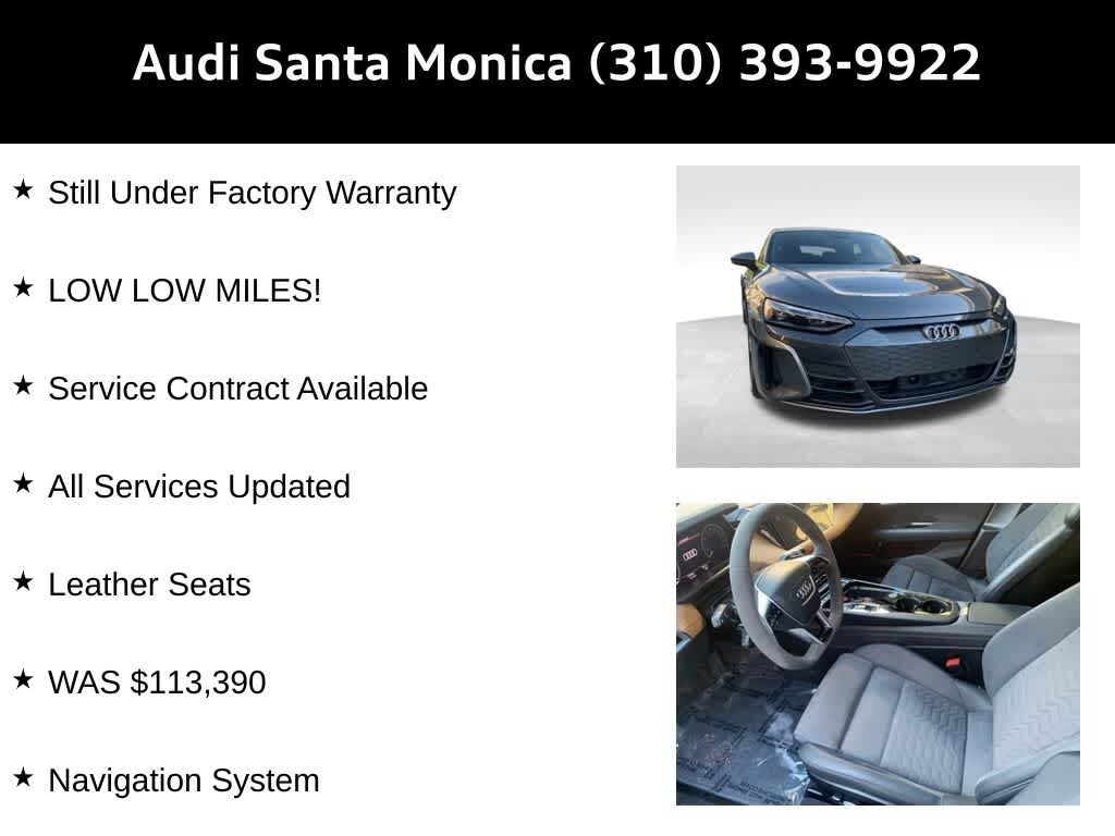 2023 Audi e-tron GT Prestige quattro Daytona Gray Pearl Effect quattro Still Under Factory Warranty, LOW LOW MILES!, Service Contract Available, All Services Updated, Leather Seats, WAS $113,390, e-tron GT Prestige quattro, 4D Sedan, Electric Motor, 1-Speed Automatic, quattro, Daytona Gray Pearl Effect, Black w/Leatherette/Dinamica Seating Surfaces or Perforated Fine Nappa Leather Seating Surfaces, 16 Speakers, Adaptive Cruise Assist w/Lane Guidance, Alloy wheels, Auto High-beam Headlights, Delay-off headlights, Driver door bin, Dual-Pane Acoustic Glass for Front Side Windows, Executive Package, Front Center Armrest, Front fog lights, Front reading lights, Genuine wood door panel insert, Head-Up Display, Heated front seats, Heated Rear Seats, Illuminated Aluminum Door Sill Inlays, Leatherette/Dinamica Seating Surfaces, LED Interior Lighting Plus Package, Navigation System, Prestige Package, Radio data system, Remote Park Assist Plus, SiriusXM w/360L, Top View Camera System, Wheels: 20 5-Double-Spoke Design. Clean CARFAX. CARFAX One-Owner.