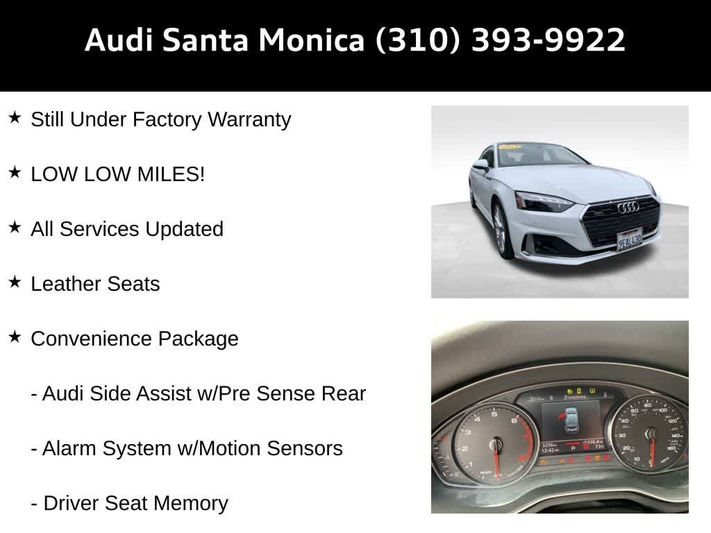 2024 Audi A5 Sportback Premium quattro Arkona White quattro Still Under Factory Warranty, LOW LOW MILES!, All Services Updated, Leather Seats, A5 Sportback Premium quattro, 4D Hatchback, 2.0L 4-Cylinder TFSI, 7-Speed Automatic S tronic, quattro, Arkona White, Black w/Leather Seating Surfaces, 10 Speakers, ABS brakes, Alarm System w/Motion Sensors, Alloy wheels, AM/FM radio, Audi Advanced Key, Audi Side Assist w/Pre Sense Rear, Auto-Dimming Exterior Mirrors w/Memory, Automatic temperature control, Bumpers: body-color, Compass, Convenience Package, Driver Seat Memory, Driver vanity mirror, Emergency communication system: Audi connect CARE, Front Center Armrest, Front reading lights, Garage door transmitter: HomeLink, Genuine wood dashboard insert, Heated door mirrors, Heated Front Bucket Seats, Leather Seating Surfaces, Low tire pressure warning, Occupant sensing airbag, Overhead console, Passenger vanity mirror, Power adjustable front head restraints, Power door mirrors, Power driver seat, Power passenger seat, Power steering, Power windows, Radio data system, Radio: Audi Sound System, Rear air conditioning, Rear seat center armrest, Rear window defroster, Remote keyless entry, SiriusXM w/360L, Speed-sensing steering, Steering wheel mounted audio controls, Telescoping steering wheel, Wheels: 18 5-V-Spoke-Y Design. Clean CARFAX. CARFAX One-Owner.