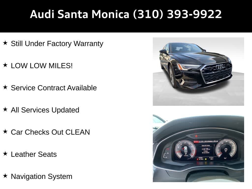 2024 Audi A6 45 Premium quattro Brilliant Black quattro Still Under Factory Warranty, LOW LOW MILES!, Service Contract Available, All Services Updated, Car Checks Out CLEAN, Leather Seats, A6 45 Premium quattro, 4D Sedan, 2.0L 4-Cylinder TFSI, 7-Speed Automatic, quattro, Brilliant Black, Black w/Leather Seating Surfaces, ABS brakes, Adaptive Cruise Assist w/Lane Guidance, Alloy wheels, Audi Side Assist w/Pre Sense Rear, Compass, Convenience Package, Electronic Stability Control, Front dual zone A/C, Heated door mirrors, Heated Front Seats, Heated front seats, Heated Steering Wheel, Illuminated entry, Low tire pressure warning, Navigation System, Power moonroof, Remote keyless entry, Top View Camera System w/Virtual 360 View, Traction control, Wireless Phone Charging Pad. Clean CARFAX. CARFAX One-Owner.