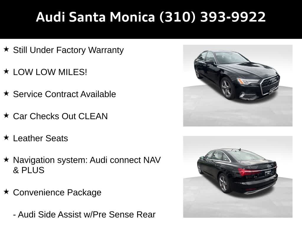 2024 Audi A6 45 Premium quattro Brilliant Black quattro Still Under Factory Warranty, LOW LOW MILES!, Service Contract Available, Car Checks Out CLEAN, Leather Seats, A6 45 Premium quattro, 4D Sedan, 2.0L 4-Cylinder TFSI, 7-Speed Automatic, quattro, Brilliant Black, Black w/Leather Seating Surfaces, 10 Speakers, ABS brakes, Adaptive Cruise Assist w/Lane Guidance, AM/FM radio: SiriusXM w/ 360L, Audi Side Assist w/Pre Sense Rear, Auto High-beam Headlights, Auto-dimming Rear-View mirror, Convenience Package, Delay-off headlights, Dual front side impact airbags, Front anti-roll bar, Front Bucket Seats, Front Center Armrest, Genuine wood console insert, Genuine wood dashboard insert, Heated front seats, Heated Steering Wheel, Leather Seating Surfaces, Leather steering wheel, Low tire pressure warning, Navigation system: Audi connect NAV & PLUS, Occupant sensing airbag, Outside temperature display, Overhead airbag, Overhead console, Panic alarm, Power passenger seat, Power steering, Power windows, Radio data system, Radio: Audi MMI Nav Plus w/MMI Touch Response, Rain sensing wipers, Rear anti-roll bar, Rear reading lights, Rear seat center armrest, Speed-sensing steering, Speed-Sensitive Wipers, Split folding rear seat, Steering wheel memory, Steering wheel mounted audio controls, Top View Camera System w/Virtual 360 View, Traction control, Wheels: 19 5-Arm Platinum Gray Dynamic Design, Wireless Phone Charging Pad. CARFAX One-Owner.