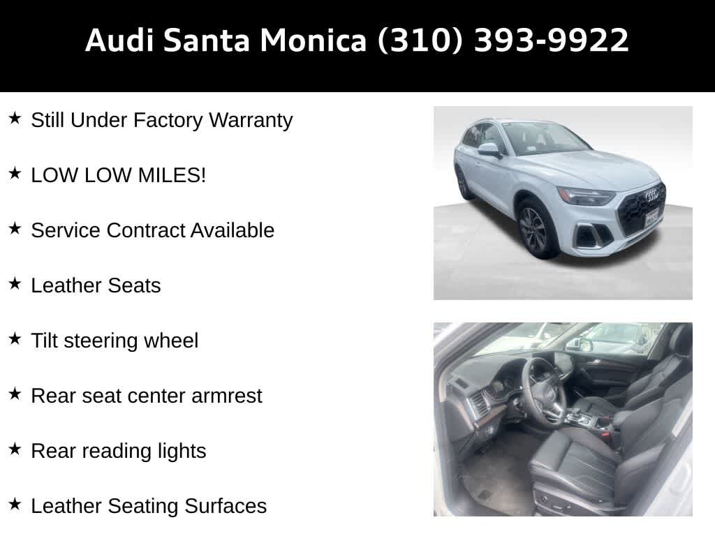 2024 Audi Q5 45 S line Premium quattro Glacier White Metallic quattro Still Under Factory Warranty, LOW LOW MILES!, Service Contract Available, Leather Seats, Q5 45 S line Premium quattro, 4D Sport Utility, 2.0L Turbocharged, 7-Speed Automatic S tronic, quattro, Glacier White Metallic, Black w/Leather Seating Surfaces, Front Center Armrest, Heated front seats, Leather Seating Surfaces, Power passenger seat, Rain sensing wipers, Rear reading lights, Rear seat center armrest, Rear window wiper, Speed-Sensitive Wipers, Tilt steering wheel, Variably intermittent wipers, Wheels: 18 5-Arm-Turbine Design. Clean CARFAX. CARFAX One-Owner.