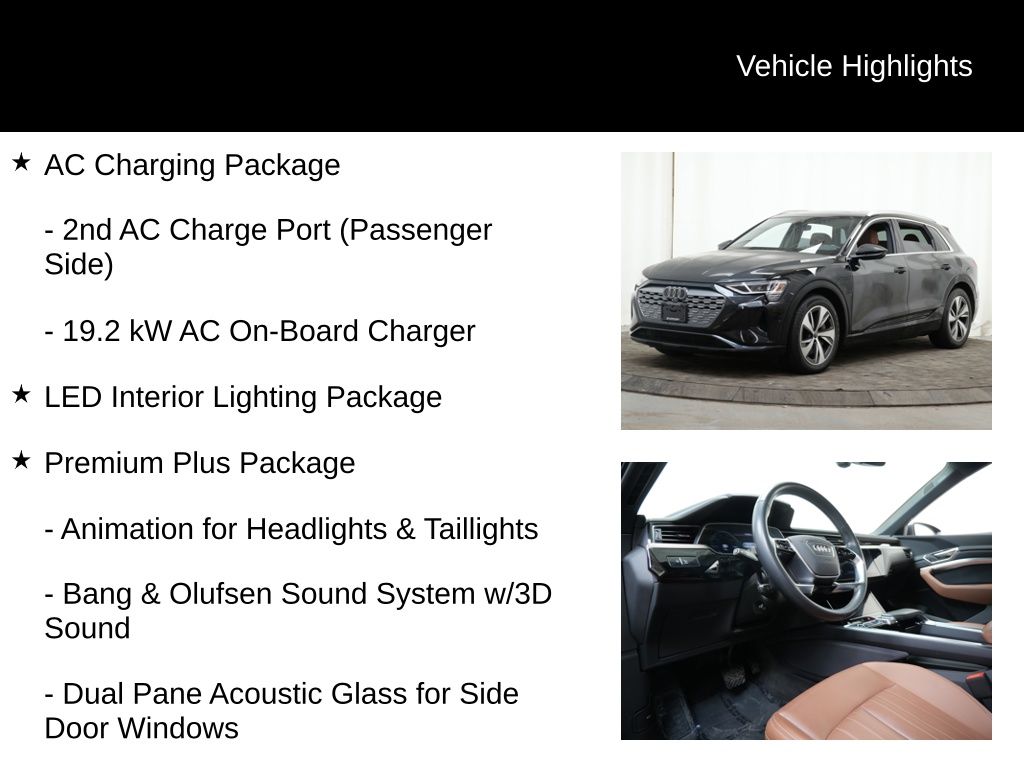 This 2024 Audi Q8 e-tron Premium Plus quattro is a true standout in the luxury electric vehicle segment. With its sleek Mythos Black Metallic exterior, this stunning SUV not only looks the part, but it also delivers uncompromising performance and cutting-edge technology.