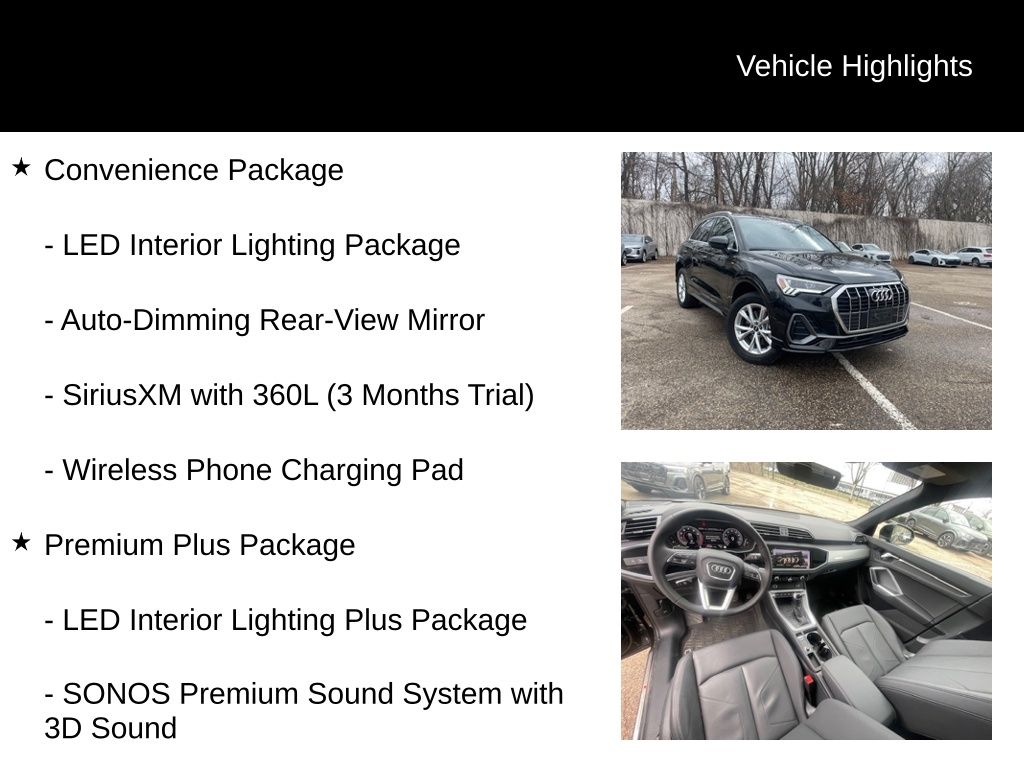 This 2025 Audi Q3 Premium Plus S Line quattro is a true standout in the luxury crossover segment. Boasting a sleek Mythos Black Metallic exterior and a sophisticated Black interior, this meticulously maintained one-owner vehicle is the perfect blend of style, performance, and advanced technology.