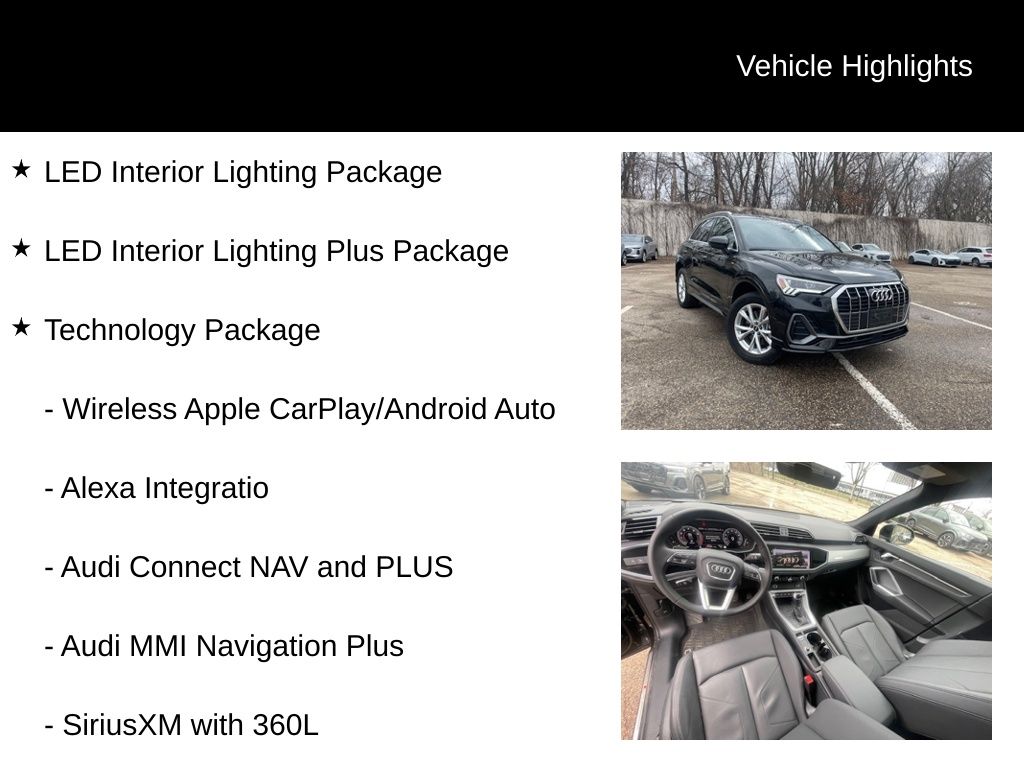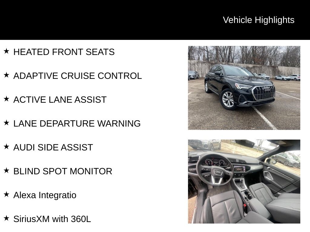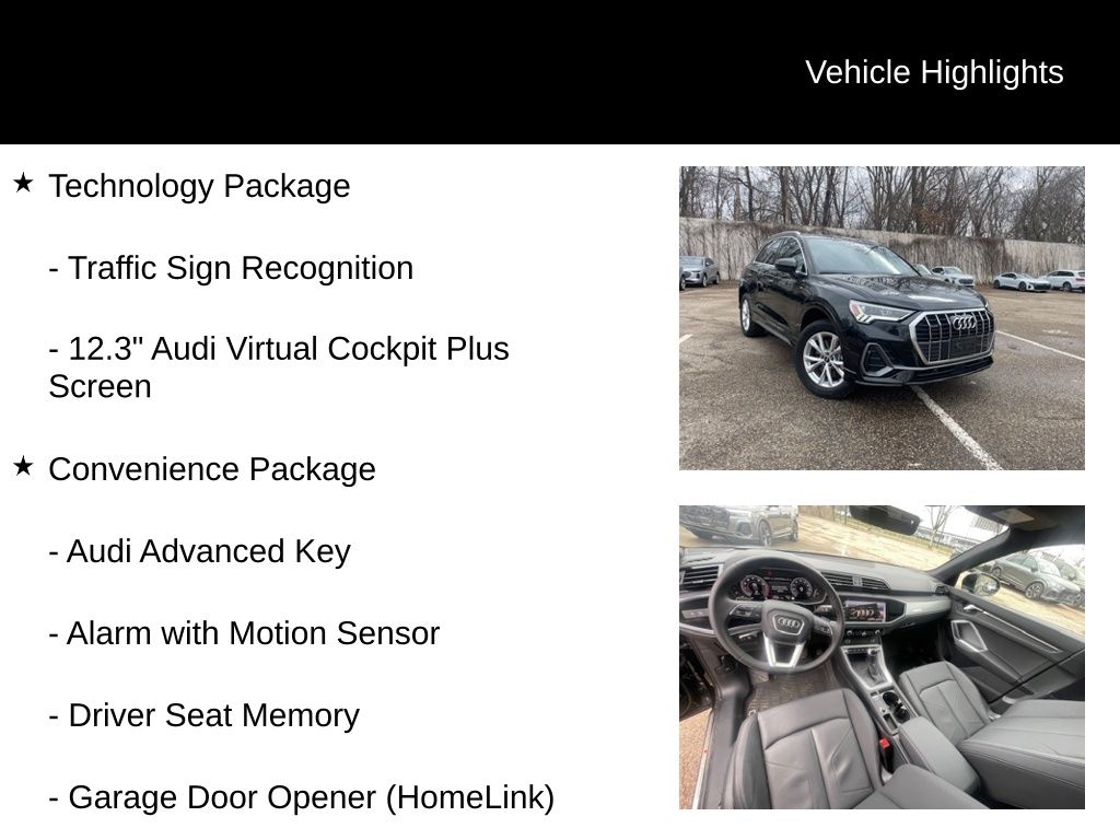 Powered by a 2.0L 4-Cylinder TFSI engine and Audi's renowned quattro all-wheel-drive system, this Q3 delivers an exceptional driving experience. With an EPA-estimated 20 city/28 highway MPG, you can enjoy the thrill of Audi performance while maintaining impressive fuel efficiency.