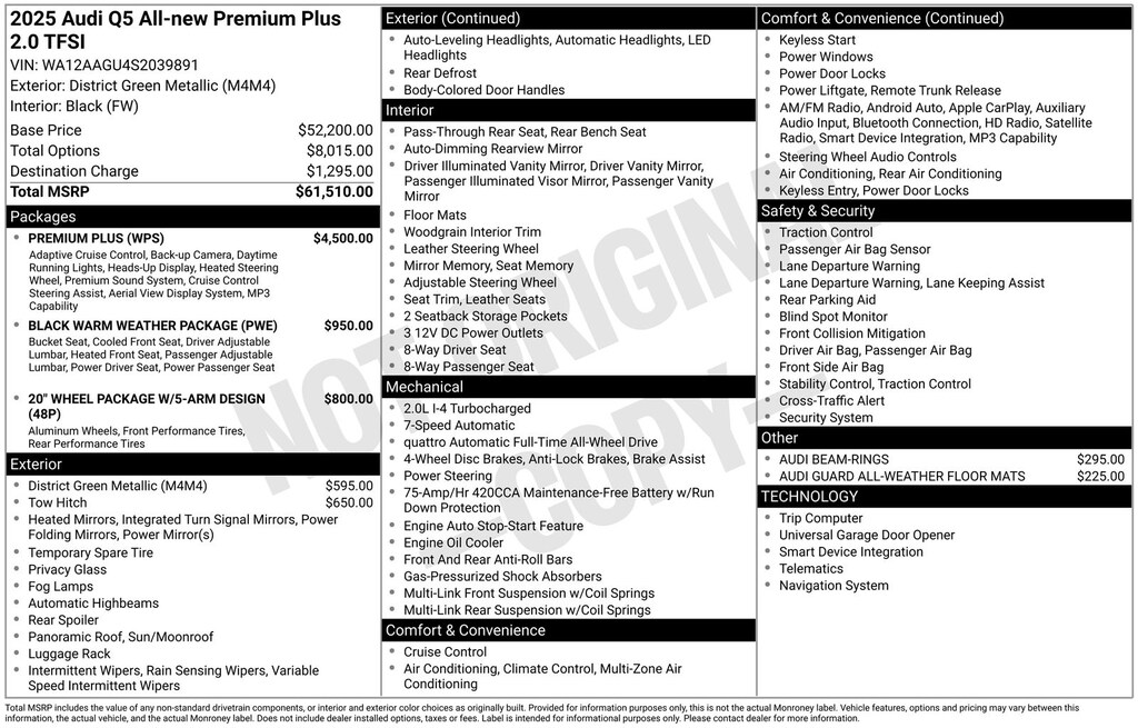 This 2025 Audi All-new Q5 2.0T Premium Plus quattro is an exceptional vehicle that offers unparalleled performance, style, and technology. With its sleek and sophisticated exterior, this SUV commands attention on the road. Under the hood, the 2.0L 4-Cylinder TFSI engine paired with the 7-Speed Automatic S tronic quattro all-wheel drive system delivers a thrilling driving experience, with an impressive fuel efficiency of 22 MPG city and 30 MPG highway.