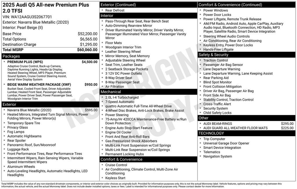 Don't miss the opportunity to own this exceptional 2025 Audi Q5 2.0T Premium Plus quattro. Schedule a test drive today and experience the ultimate in luxury, performance, and peace of mind.