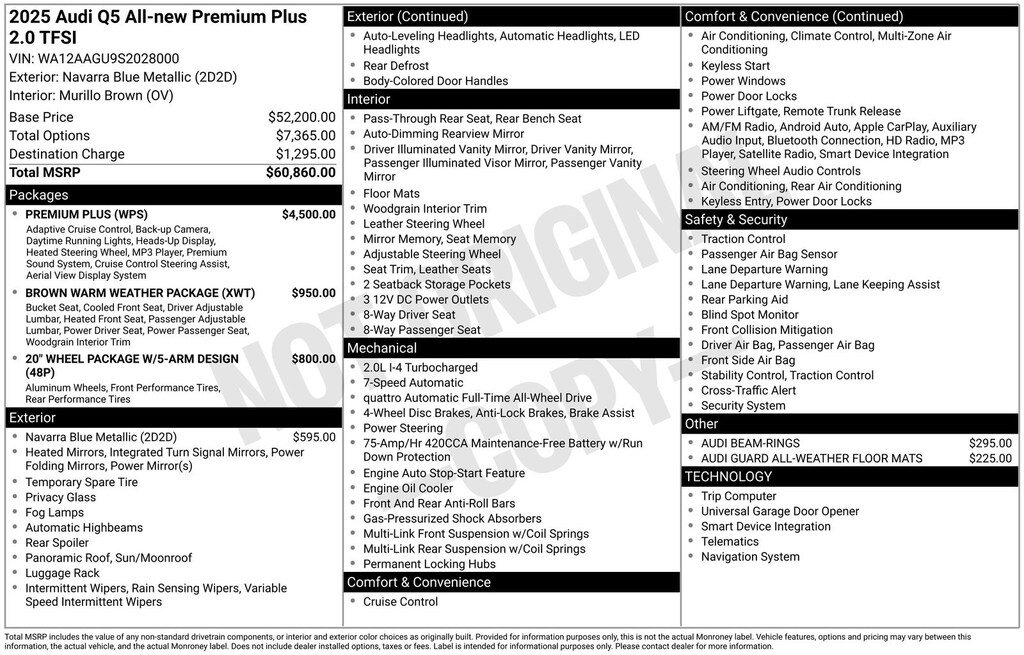 With its exceptional craftsmanship, advanced technology, and uncompromising performance, this 2025 Audi Q5 2.0T Premium Plus quattro is the perfect blend of luxury and capability. We invite you to experience the difference for yourself. Schedule a test drive today and let us show you why this Audi should be your next vehicle.