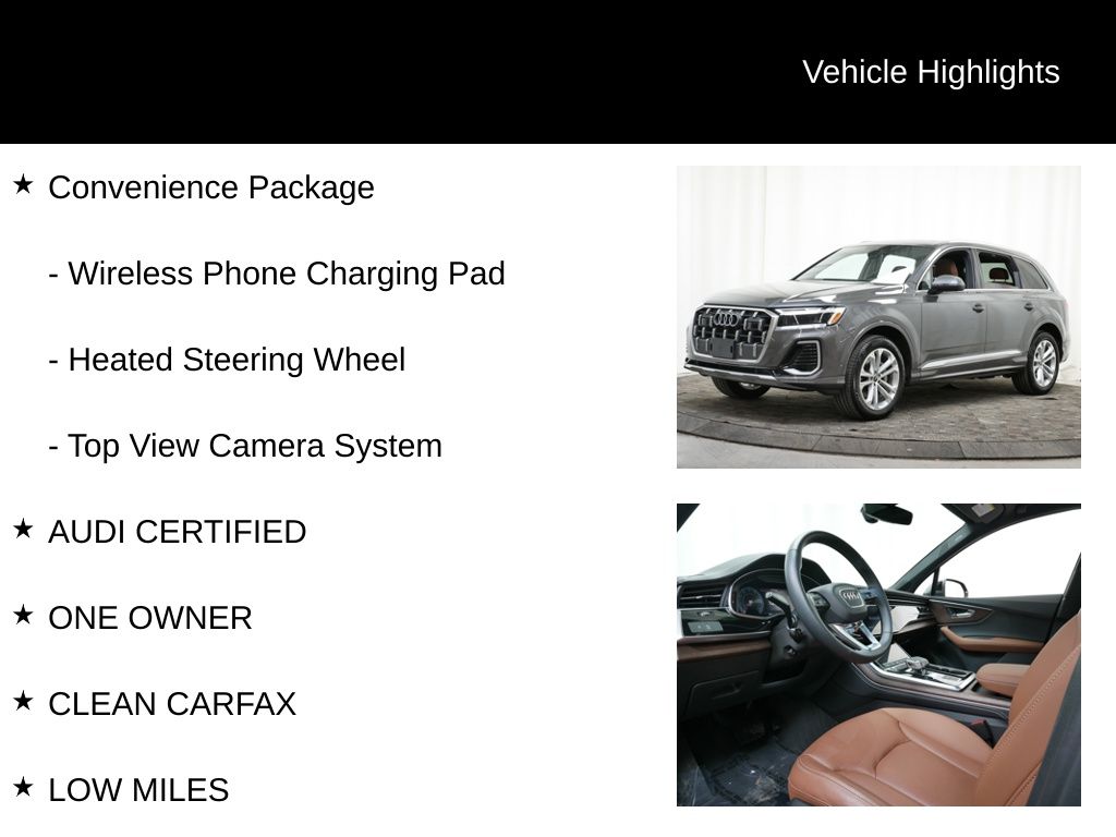 The Premium Plus package elevates this Q7 with a host of premium features, including a Bang & Olufsen premium sound system, wireless phone charging, and a top-view camera system. The Executive package further enhances the experience with amenities like heated rear seats, four-zone climate control, and ventilated front seats.