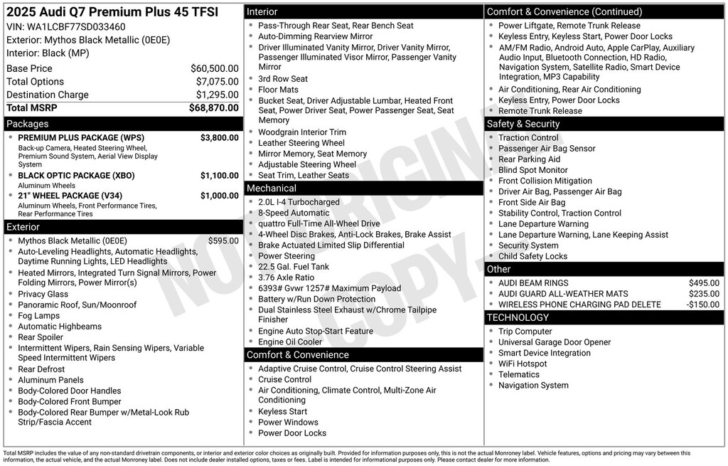 I encourage you to schedule a test drive and experience the exceptional quality, performance, and features of this 2025 Audi Q7 45 Premium Plus quattro. I'm confident you'll be impressed by its exceptional capabilities and luxurious appointments. Let me know if you have any other questions â" I'm here to help you find the perfect vehicle to meet your needs.