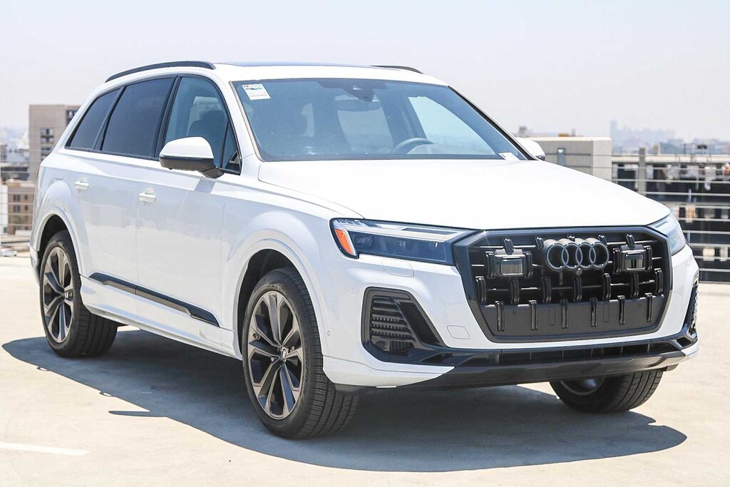 MULTI POINT SAFETY AND MECHANICAL INSPECTION PERFORMED BY CERTIFIED TECHNICIAN, PERFORMED SERVICE, INTERIOR and EXTERIOR DETAILED FOR DELIVERY, 10 Speakers, 3rd row seats: bench, 4-Wheel Disc Brakes, 7-Pin Adapter, ABS brakes, Air Conditioning, Alloy wheels, AM/FM radio: SiriusXM w/ 360L, Anthracite Gray Audi Rings, Audi Beam Rings, Audi Cargo Box, Auto High-beam Headlights, Auto-dimming door mirrors, Auto-dimming Rear-View mirror, Automatic temperature control, Bang & Olufsen Premium Sound System w/3D Sound, Black Door Blades, Black Exterior Trim, Black Grille, Black Optic Package, Black Roof Rails, Black Window Surrounds, Brake assist, Bumpers: body-color, Compass, Convenience Package, Dark Chrome Exhaust Tips, Delay-off headlights, Driver door bin, Driver vanity mirror, Dual front impact airbags, Dual front side impact airbags, Dual-Pane Acoustic Glass for Side Windows, Electronic Stability Control, Emergency communication system: Audi connect CARE, Executive Package (DISC), Exterior Parking Camera Rear, Four wheel independent suspension, Four-Zone Automatic Climate Control, Front anti-roll bar, Front Bucket Seats, Front Center Armrest, Front dual zone A/C, Front fog lights, Front reading lights, Front Seats w/Ventilation, Fully automatic headlights, Garage door transmitter: HomeLink, Genuine wood door panel insert, Heated door mirrors, Heated Front Bucket Seats, Heated front seats, Heated Rear Seats, Heated Steering Wheel, Illuminated Door Sills, Illuminated entry, Leather Seating Surfaces, Leather Shift Knob, Leather steering wheel, LED Interior Lighting Package Plus, Low tire pressure warning, Memory seat, Navigation system: Audi MMI Navigation plus with Touch Response, Occupant sensing airbag, Outside temperature display, Overhead airbag, Overhead console, Panic alarm, Passenger door bin, Passenger vanity mirror, Power door mirrors, Power driver seat, Power Liftgate, Power moonroof: Panoramic, Power passenger seat, Power steering, Power windows, Premium Plus Package, Privacy Trunk Cover, Radio data system, Radio: Audi Sound System, Rain sensing wipers, Rear air conditioning, Rear anti-roll bar, Rear Door/Side Windows & Tailgate Sunshades, Rear fog lights, Rear reading lights, Rear seat center armrest, Rear side impact airbag, Rear window defroster, Rear window wiper, Reclining 3rd row seat, Remote keyless entry, Security system, Speed control, Speed-sensing steering, Split folding rear seat, Spoiler, Steering wheel memory, Steering wheel mounted audio controls, Tachometer, Telescoping steering wheel, Tilt steering wheel, Top View Camera System, Traction control, Traffic Sign Recognition, Trailer Hitch, Trip computer, Turn signal indicator mirrors, Variably intermittent wipers, Wheels: 19 5-Arm-Star Design, Wheels: 20 5-Double-Spoke, Wheels: 21 5-Double-Spoke-Design Matte Gray, Wireless Phone Charging Pad, Wireless Phone Charging Pad Delete. Glacier White Metallic 2025 Audi Q7 55 Premium Plus quattro quattro 8-Speed Automatic with Tiptronic 3.0L TFSI