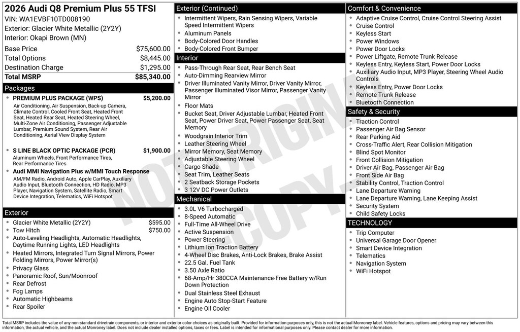 Don't miss the opportunity to experience the exceptional performance, advanced technology, and refined luxury of this 2026 Audi Q8 55 Premium Plus quattro. Schedule a test drive today and discover why this SUV is the perfect blend of power, style, and sophistication.