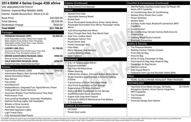 Blue 2014 BMW 4 Series 428i xDrive 2D Coupe AWD 8-Speed Automatic 2.0L 4-Cylinder DOHC 16V Turbocharged 22/33 City/Highway MPG