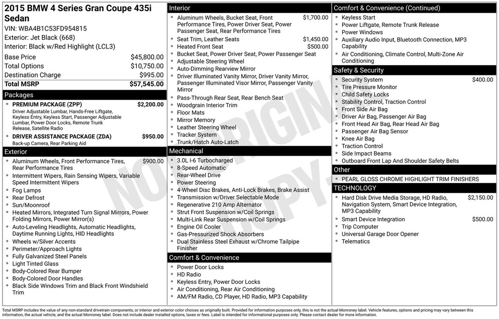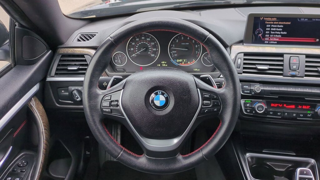 Clean CARFAX. 2015 BMW 4 Series 435i Gran Coupe Is nicely equipped with Driver Assistance Package (Park Distance Control and Rear-View Camera), Premium Package (Comfort Access Keyless Entry, Dakota Leather Upholstery, Lumbar Support, and Satellite Radio), Sport Line (Anthracite Headliner, Black Door Mirror Caps, High-Gloss Black Interior Trim, M Sport Suspension, Sport Line Aesthetic Elements, Sport Seats, Wheels: 18" x 8" Double-Spoke (Style 397), Without Exterior Lines Designation, and Increased Top Speed Limit), Navigation System, 4-Wheel Disc Brakes, 9 Speakers, ABS brakes, Advanced Real-Time Traffic Information, Air Conditioning, Alloy wheels, AM/FM radio, Anti-Theft Alarm System, Anti-whiplash front head restraints, Ash Grain Fine Wood Trim w/Metal Inlay, Auto-dimming door mirrors, Auto-dimming Rear-View mirror, Automatic temperature control, BMW Online & BMW Apps, Brake assist, Bumpers: body-color, CD player, Delay-off headlights, Driver door bin, Driver vanity mirror, Dual front impact airbags, Dual front side impact airbags, Electronic Stability Control, Emergency communication system: BMW Assist eCall, Enhanced USB & Bluetooth w/Smartphone Integration, Four wheel independent suspension, Front anti-roll bar, Front Bucket Seats, Front Center Armrest, Front dual zone A/C, Front fog lights, Front reading lights, Fully automatic headlights, Garage door transmitter, Genuine wood console insert, Genuine wood dashboard insert, Genuine wood door panel insert, Hands-Free Bluetooth & USB Audio Connection, Heated door mirrors, Heated Front Seats, Hi-Fi Sound System, High intensity discharge headlights: Bi-xenon, Illuminated entry, Instrument Cluster w/Extended Contents, Knee airbag, Leather Shift Knob, Leather steering wheel, Low tire pressure warning, Memory seat, Navigation System w/Touchpad, Occupant sensing airbag, Outside temperature display, Overhead airbag, Panic alarm, Passenger door bin, Passenger vanity mirror, Pearl Gloss Chrome Highlight Trim Finishers (DISC), Power door mirrors, Power driver seat, Power Liftgate, Power moonroof, Power passenger seat, Power steering, Power windows, Radio data system, Radio: Anti-Theft AM/FM/HD Stereo CD/MP3 Player, Rain sensing wipers, Rear air conditioning, Rear anti-roll bar, Rear reading lights, Rear seat center armrest, Rear window defroster, Remote keyless entry, Remote Services, Security system, SensaTec Leatherette Upholstery, Speed control, Speed-sensing steering, Speed-Sensitive Wipers, Split folding rear seat, Sport steering wheel, Steering wheel mounted audio controls, Tachometer, Telescoping steering wheel, Tilt steering wheel, Traction control, Trip computer, Turn signal indicator mirrors, Variably intermittent wipers, Wheels: 18" x 8" Lt Alloy Star-Spoke (Style 396), and Wheels: 19" Light Alloy Star-Spoke (Style 407)