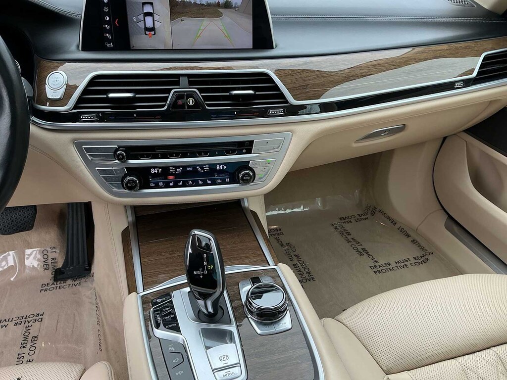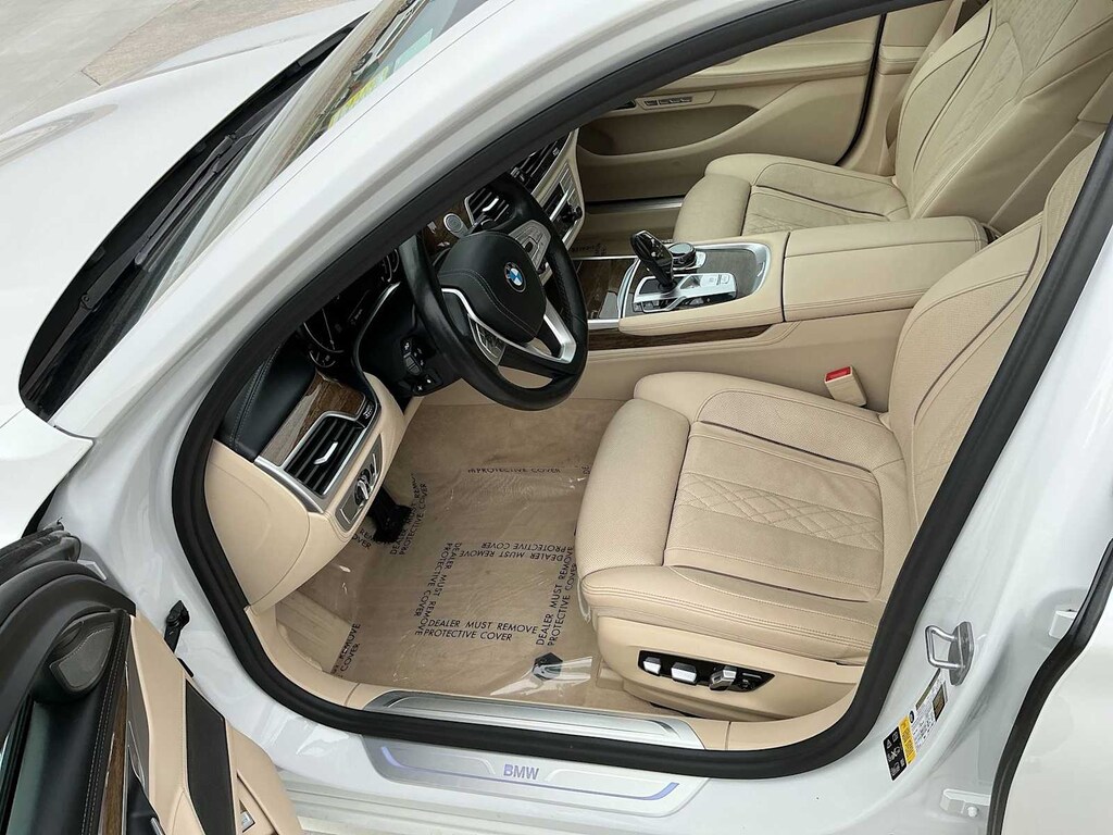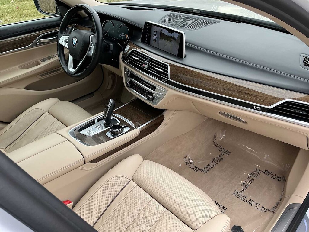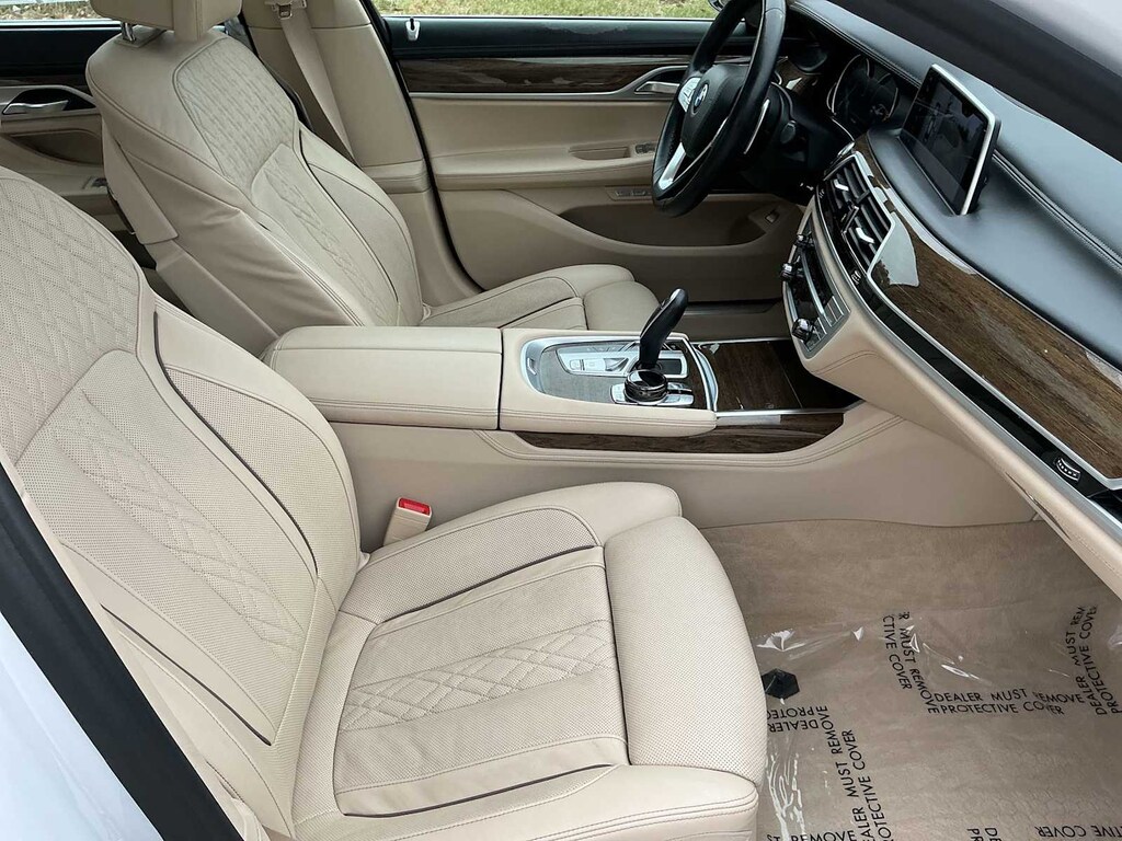 750i xDrive is nicely equipped with Driver Assistance Plus Package (Active Cruise Control w/Stop & Go, Active Driving Assistant Plus, Active Lane Keeping Assistant, and Traffic Jam Assistant), Executive Package (Ceramic Controls, Front Massaging Seats, Front Ventilated Seats, Instrument Panel w/Nappa Leather Finish, and Power Rear Sunshade & Rear Side Window Shades), Ambient Air Package, Cold Weather Package (Front & Rear Heated Seats and Heated Steering Wheel), Driver Assistance Package (Active Blind Spot Detection, Active Driving Assistant, Daytime Pedestrian Protection, Frontal Collision Warning, Lane Departure Warning System, and Speed Limit Info), Parking Assistance Package (Parking Assistant and Surround View Cameras), AWD, Canberra Beige Leather, 16 Speakers, 4-Wheel Disc Brakes, ABS brakes, Adaptive suspension, Air Conditioning, Alloy wheels, AM/FM radio: SiriusXM, American Oak Wood Trim w/Metal Inlay, Anti-whiplash front head restraints, Apple CarPlay Compatibility, Auto High-beam Headlights, Auto tilt-away steering wheel, Auto-dimming door mirrors, Auto-dimming Rear-View mirror, Auto-leveling suspension, Automatic temperature control, Brake assist, Bumpers: body-color, CD player, Delay-off headlights, Door auto-latch, Driver door bin, Driver vanity mirror, Dual front impact airbags, Dual front side impact airbags, Electronic Stability Control, Emergency communication system: BMW Assist eCall, Exterior Parking Camera Rear, Four wheel independent suspension, Front anti-roll bar, Front Bucket Seats, Front Center Armrest, Front dual zone A/C, Front fog lights, Front reading lights, Fully automatic headlights, Garage door transmitter, Genuine wood console insert, Genuine wood dashboard insert, Genuine wood door panel insert, harman/kardon Surround Sound System, harman/kardonî Speakers, Head restraints memory, Heads-Up Display, Heated door mirrors, Heated Front Seats, Heated front seats, Illuminated entry, Knee airbag, Leather Shift Knob, Leather steering wheel, Low tire pressure warning, Memory seat, Multi-Contour Seats, Navigation System, Occupant sensing airbag, Outside temperature display, Overhead airbag, Overhead console, Panic alarm, Panoramic Sky Lounge LED Roof, Passenger door bin, Passenger vanity mirror, Perforated Nappa Leather Upholstery, Power adjustable front head restraints, Power door mirrors, Power driver seat, Power moonroof, Power passenger seat, Power steering, Power windows, Radio Control US, Radio data system, Radio: AM/FM/HD w/In-Dash Single CD, Rain sensing wipers, Rear air conditioning, Rear anti-roll bar, Rear dual zone A/C, Rear reading lights, Rear seat center armrest, Rear Window Blind, Rear window defroster, Remote keyless entry, Security system, SiriusXM Satellite Radio, Speed control, Speed-sensing steering, Speed-Sensitive Wipers, Sport steering wheel, Steering wheel memory, Steering wheel mounted audio controls, Tachometer, Telescoping steering wheel, Tilt steering wheel, Traction control, Trip computer, Variably intermittent wipers, Weather band radio, and Wheels: 19 x 8.5 Light Alloy Dbl-Spoke (Style 630)