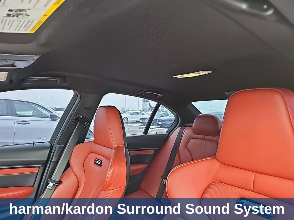 This M3 is well equipped with Competition Package (BMW Individual High-Gloss Shadow Line, Lumbar Support Delete, and Wheels: 20" x 9" Front/20" x 10" Rear), Competition Package (7MA), Driving Assistance Package (Active Driving Assistant and Speed Limit Info), Executive Package (Automatic High Beams, Head-Up Display, Heated Rear Seats, Heated Steering Wheel, Icon Adaptive Full LED Headlights, Park Distance Control, Parking Assistant, and Side & Top View Cameras), M Competition Package, 4D Sedan, 3.0L I6, 7-Speed Automatic, RWD, Black Sapphire Metallic, Sakhir Orange/Black Sakhir Orange/Black Ext Lthr, 16 Speakers, 4-Wheel Disc Brakes, ABS brakes, Active Blind Spot Detection, Adaptive suspension, Air Conditioning, Alloy wheels, AM/FM radio: SiriusXM, Apple CarPlay Compatibility, Auto-dimming door mirrors, Auto-dimming Rear-View mirror, Automatic temperature control, Brake assist, Bumpers: body-color, CD player, Cloth/Leather Upholstery, Dark Red Sycamore Wood Trim, Delay-off headlights, Driver vanity mirror, Dual front impact airbags, Dual front side impact airbags, DVD-Audio, Electronic Stability Control, Emergency communication system: BMW Assist eCall, Exterior Parking Camera Rear, Four wheel independent suspension, Front anti-roll bar, Front Bucket Seats, Front Center Armrest, Front dual zone A/C, Front reading lights, Fully automatic headlights, Garage door transmitter, harman/kardon Surround Sound System, harman/kard
