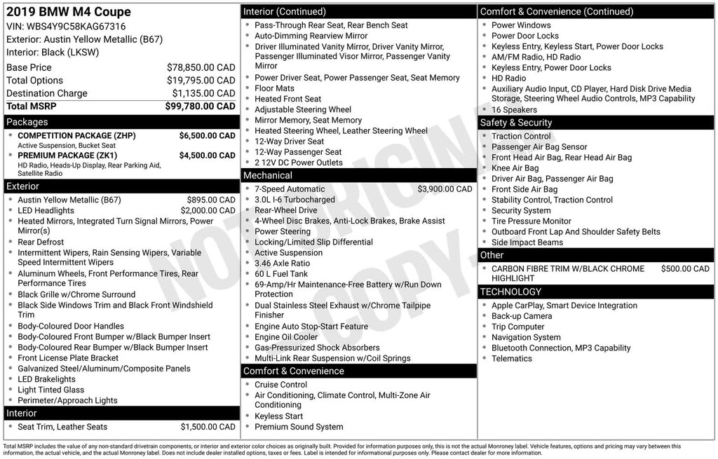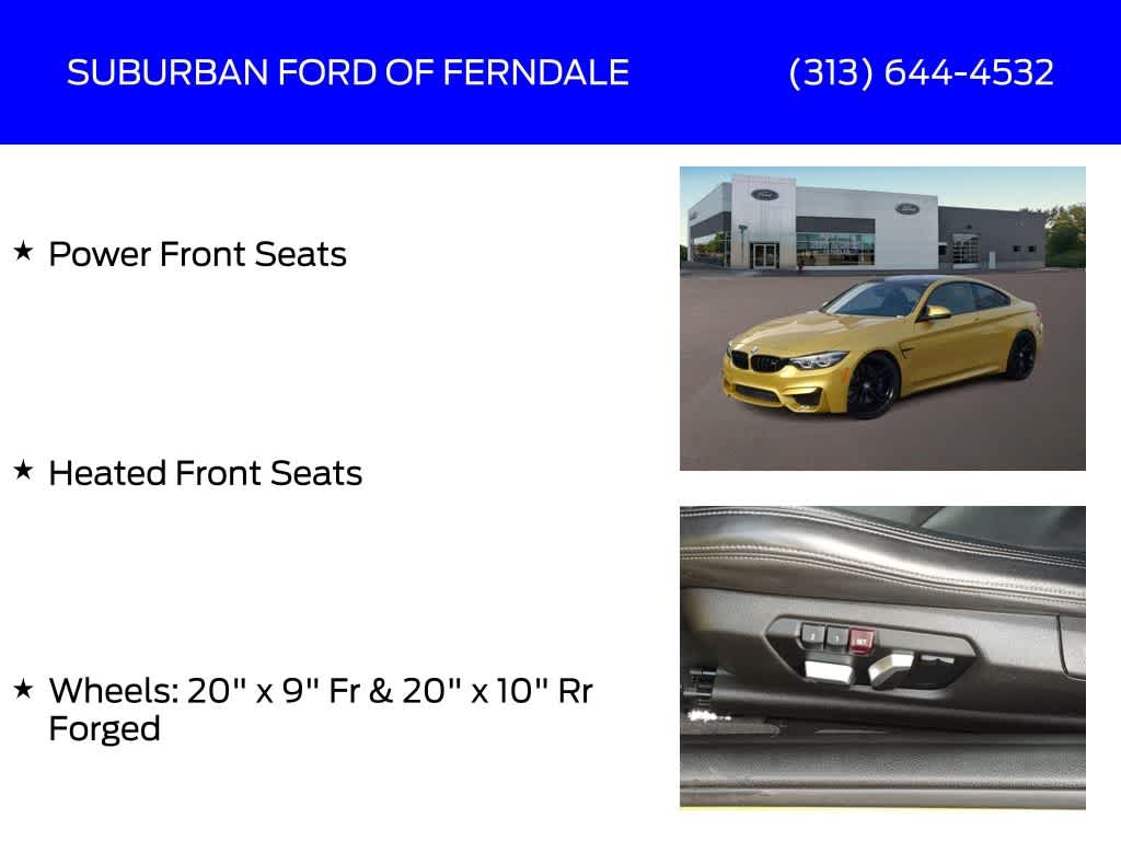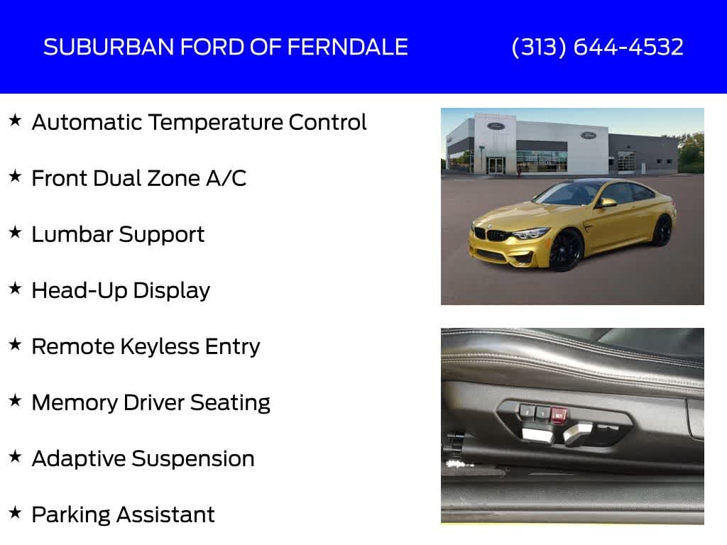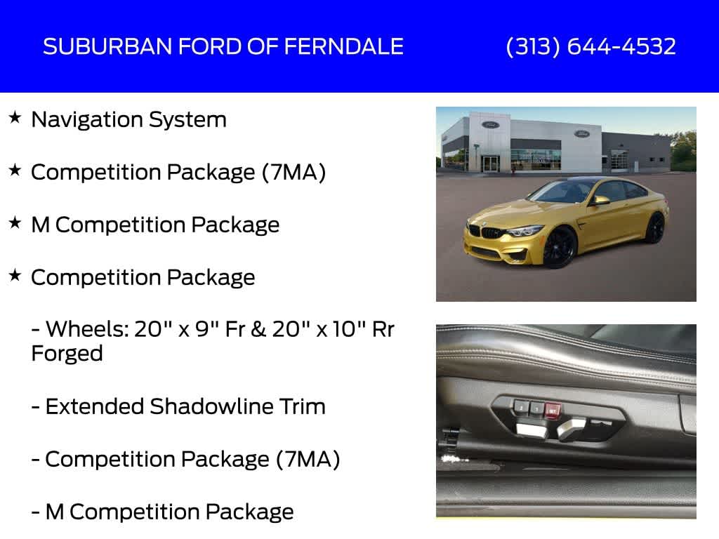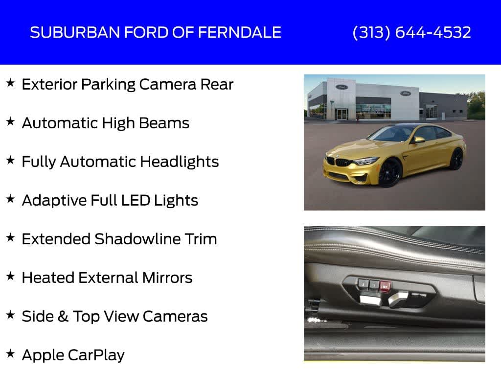 Austin Yellow Metallic 2019 BMW M4 RWD 7-Speed Automatic 3.0L 6-Cylinder Turbocharged DOHC Adaptive Full LED Lights, Adaptive Suspension, AM/FM Radio: SiriusXM, Apple CarPlay, Automatic High Beams, Automatic Temperature Control, Competition Package, Competition Package (7MA), Executive Package, Extended Shadowline Trim, Exterior Parking Camera Rear, Front Dual Zone A/C, Fully Automatic Headlights, harman/kardon Surround Sound System, Head-Up Display, Heated External Mirrors, Heated Front Seats, Lumbar Support, M Competition Package, Memory Driver Seating, Navigation System, Parking Assistant, Power Front Seats, Remote Keyless Entry, Side & Top View Cameras, Wheels: 20 x 9 Fr & 20 x 10 Rr Forged.