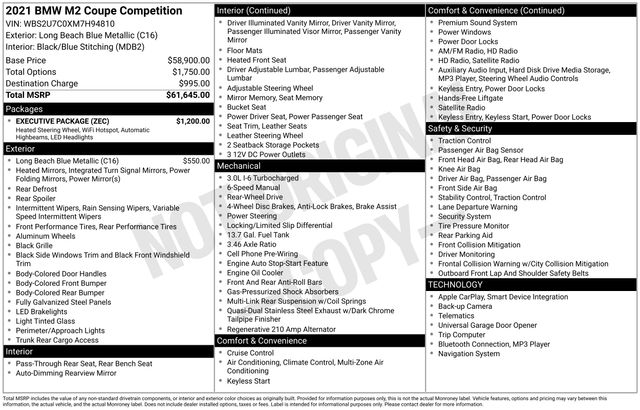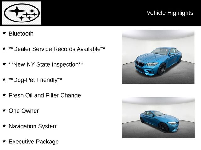 Discover the thrill of the open road with this exceptional 2021 BMW M2 Competition. This high-performance coupe boasts a powerful 3.0L I6 engine paired with a smooth 6-speed manual transmission, delivering an exhilarating driving experience that will leave you craving more. Finished in the striking Blue exterior color, this M2 Competition commands attention wherever it goes.