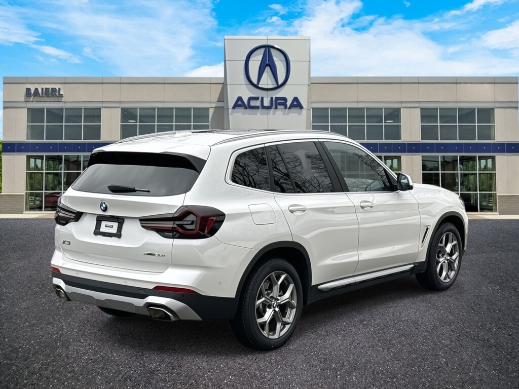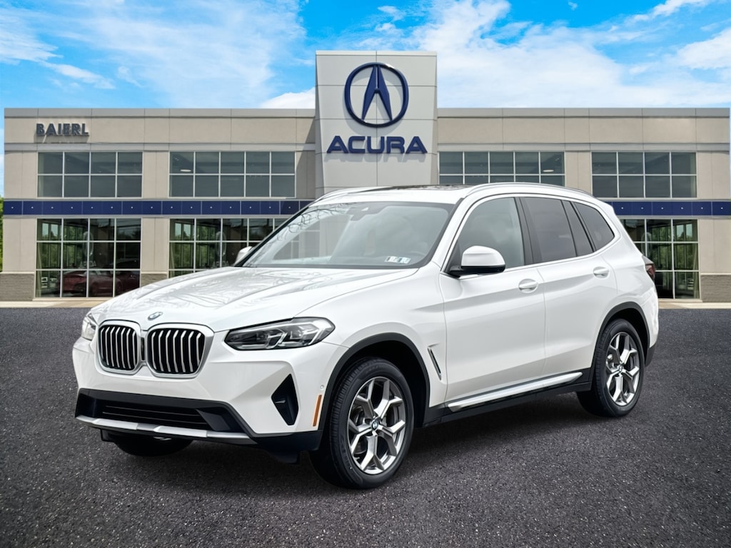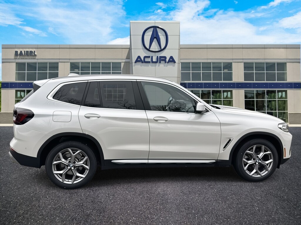Baierl Acura is very proud to offer this good-looking 2023 BMW X3 in Mineral White Metallic. This vehicle has been through our award winning factory trained service department*** and comes with the following features; Balance of Factory Warranty, Theres no back-and-forth, we offer one fair price, CLEAN CARFAX, PREMIUM PACKAGE, PARKING ASSISTANCE PACKAGE, FACTORY REMOTE START, COMFORT ACCESS KEYLESS ENTRY, HEATED FRONT SEATS, HEATED STEERING WHEEL, PANORAMIC ROOF SYSTEM, NAVIGATION SYSTEM, HI-FI SOUND SYSTEM, APPLE CARPLAY / ANDROID AUTO, SURROUND VIEW CAMERA SYSTEM WITH 3D VIEW, WIFI HOT SPOT, SIRIUSXM, MULTI-ZONE CLIMATE CONTROL, REAR HEAT AND AIR CONDITIONING, AMBIENT LIGHTING, ACTIVE PARK DISTANCE CONTROL, ACTIVE DRIVING ASSISTANT, FRONT COLLISION WARNING, ACTIVE BLIND SPOT DETECTION SYSTEM, LANE DEPARTURE WARNING SYSTEM, 19 Y-SPOKE FERRIC GRAY 693 WHEELS, POWER LIFTGATE, 8-Speed Automatic Sport, 12 Speakers, 4-Wheel Disc Brakes, ABS brakes, Active Park Distance Control, Aluminum Trim, AM/FM Radio, Apple CarPlay & Android Auto Compatibility, Auto High-beam Headlights, Auto-dimming door mirrors, Auto-dimming Rear-View mirror, BMW Assist eCall, BMW TeleServices, Brake assist, Bumpers: body-color, Connected Package Pro, ConnectedDrive Services, Delay-off headlights, Driver door bin, Driver Lumbar Support, Driver vanity mirror, Dual front impact airbags, Dual front side impact airbags, Electronic Stability Control, Emergency communication system: BMW Assist eCall, Enhanced USB & Bluetooth w/Smartphone Integration, Four wheel independent suspension, Front anti-roll bar, Front Center Armrest, Front dual zone A/C, Front reading lights, Fully automatic headlights, Garage door transmitter, Genuine wood dashboard insert, Genuine wood door panel insert, Heated door mirrors, Heated Front Seats, Heated Steering Wheel, Hi-Fi Sound System, Illuminated entry, Knee airbag, Live Cockpit Pro w/Navigation, Low tire pressure warning, Memory seat, Navigation, Navigation System, Occupant sensing airbag, Outside temperature display, Overhead airbag, Panic alarm, Panoramic Moonroof, Parking Assistance Package, Parking Assistant Plus, Passenger door bin, Passenger vanity mirror, Perforated SensaTec Upholstery, Power door mirrors, Power driver seat, Power Front Seats, Power Liftgate, Power steering, Power windows, Premium Package, Radio data system, Rear air conditioning, Rear anti-roll bar, Rear reading lights, Rear seat center armrest, Rear window defroster, Rear window wiper, Rear-View Camera, Remote Engine Start, Remote keyless entry, Security system, SiriusXM Satellite Radio, Speed control, Speed-sensing steering, Speed-Sensitive Wipers, Split folding rear seat, Spoiler, Sport Seats, Sport steering wheel, Steering wheel mounted audio controls, Surround View w/3D View, Tachometer, Telescoping steering wheel, Traction control, Trip computer, Turn signal indicator mirrors, Wheels: 19 x 7.5 Y-Spoke (Style 693), WiFi Hotspot.