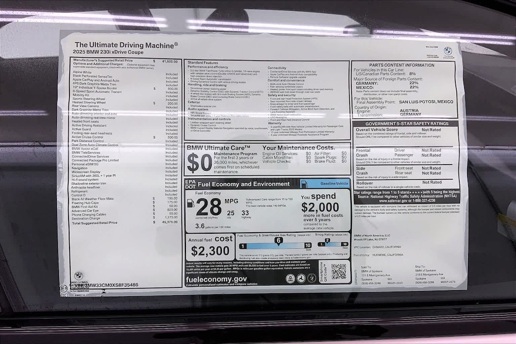 CARFAX One-Owner. Clean CARFAX. Alpine White 2025 BMW 2 Series 230i xDrive AWD 8-Speed Automatic Sport 2.0L I4 16V TwinPower Turbo 10 Speakers, 4-Wheel Disc Brakes, ABS brakes, Active Cruise Control, Air Conditioning, Alloy wheels, AM/FM radio: SiriusXM, Apple CarPlay & Android Auto Compatibility, Auto-dimming door mirrors, Auto-dimming Rear-View mirror, Automatic temperature control, BMW Assist eCall, BMW TeleServices, Brake assist, Bumpers: body-color, Connected Package Pro, ConnectedDrive Services, Delay-off headlights, Driver door bin, Driver vanity mirror, Dual front impact airbags, Dual front side impact airbags, Electronic Stability Control, Emergency communication system: BMW Assist eCall, Exterior Parking Camera Rear, Four wheel independent suspension, Front anti-roll bar, Front Bucket Seats, Front Center Armrest, Front dual zone A/C, Front reading lights, Front Sport Seats, Fully automatic headlights, Heated door mirrors, Heated Front Seats, Heated front seats, Heated Steering Wheel, Hi-Fi Sound System, Illuminated entry, Knee airbag, Leather Shift Knob, Low tire pressure warning, Memory seat, Navigation, Navigation System, Occupant sensing airbag, Outside temperature display, Overhead airbag, Panic alarm, Passenger door bin, Passenger vanity mirror, Perforated Sensatec Upholstery, Personal eSIM 5G, Power door mirrors, Power driver seat, Power Front Seats, Power passenger seat, Power steering, Power windows, Radio data system, Radio: AM/FM Audio System, Rain sensing wipers, Rear air conditioning, Rear anti-roll bar, Rear window defroster, Remote keyless entry, Security system, SiriusXM w/360L, Speed control, Speed-sensing steering, Speed-Sensitive Wipers, Split folding rear seat, Sport steering wheel, Steering wheel mounted audio controls, Tachometer, Telescoping steering wheel, Tilt steering wheel, Traction control, Trip computer, Turn signal indicator mirrors, Variably intermittent wipers, Wheels: 18 x 7.5 V-Spoke Bicolor Orbit Grey, Wheels: 19 x 8.0 Fr & 19 x 8.5 Rr Y-Spoke, Widescreen Display.