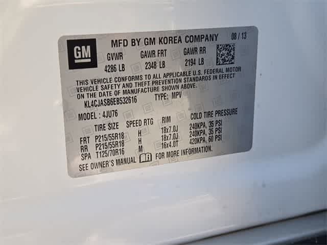 This 2014 Buick Encore in White Pearl Tricoat, features 1SB Equipment Group, 3.53 Final Drive Ratio, 4-Wheel Disc Brakes, 6 Speakers, ABS brakes, Air Conditioning, Alloy wheels, AM/FM radio: SiriusXM, Brake assist, Bumpers: body-color, CD player, Compass, Delay-off headlights, Driver door bin, Driver vanity mirror, Drivers Seat Mounted Armrest, Dual front impact airbags, Dual front side impact airbags, Electronic Stability Control, Emergency communication system: OnStar Directions & Connections, Exterior Parking Camera Rear, Front anti-roll bar, Front Bucket Seats, Front reading lights, Front wheel independent suspension, Fully automatic headlights, Heated door mirrors, Illuminated entry, Knee airbag, Leather steering wheel, Low tire pressure warning, Occupant sensing airbag, Outside temperature display, Overhead airbag, Panic alarm, Passenger door bin, Passenger vanity mirror, Power door mirrors, Power driver seat, Power steering, Power windows, Premium audio system: IntelliLink, Radio data system, Radio: AM/FM Audio System w/MP3 CD Player, Rear seat center armrest, Rear side impact airbag, Rear window defroster, Rear window wiper, Remote keyless entry, Ride & Handling Suspension, Roof rack: rails only, Security system, SiriusXM Satellite Radio, Speed control, Speed-sensing steering, Split folding rear seat, Spoiler, Steering wheel mounted audio controls, Tachometer, Telescoping steering wheel, Tilt steering wheel, Traction control, Trip computer, Turn signal indicator mirrors, Upscale Cloth w/Leatherette Accents, Variably intermittent wipers, and Wheels: 18 Painted Cast Aluminum: