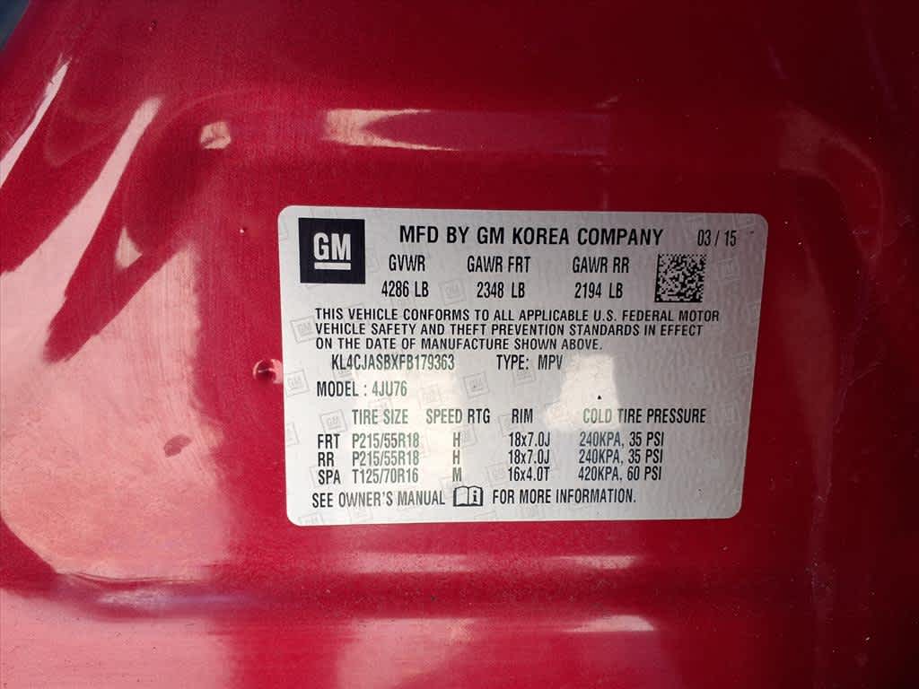 2-Way Manual Front Passenger Seat Adjuster, 3.53 Final Drive Axle Ratio, 4-Wheel Disc Brakes, 6 Speakers, 6-Way Power Driver Seat Adjuster, ABS brakes, Air Conditioning, Alloy wheels, AM/FM radio: SiriusXM, Brake assist, Bumpers: body-color, CD player, Compass, Delay-off headlights, Driver door bin, Driver vanity mirror, Drivers Seat Mounted Armrest, Dual front impact airbags, Dual front side impact airbags, Electronic Stability Control, Emergency communication system: OnStar Directions & Connections, Exterior Parking Camera Rear, Front anti-roll bar, Front Bucket Seats, Front License Plate Bracket, Front reading lights, Front wheel independent suspension, Fully automatic headlights, Heated door mirrors, Illuminated entry, Knee airbag, Leather steering wheel, Low tire pressure warning, Occupant sensing airbag, Outside temperature display, Overhead airbag, Panic alarm, Passenger door bin, Passenger vanity mirror, Power door mirrors, Power driver seat, Power steering, Power windows, Preferred Equipment Group 1SB, Premium audio system: IntelliLink, Radio data system, Radio: AM/FM Audio System w/MP3 CD Player, Rear seat center armrest, Rear side impact airbag, Rear window defroster, Rear window wiper, Remote keyless entry, Ride & Handling Suspension, Roof rack: rails only, Security system, SiriusXM Satellite Radio, Speed control, Speed-sensing steering, Split folding rear seat, Spoiler, Steering wheel mounted audio controls, Tachometer, Telescoping steering wheel, Tilt steering wheel, Traction control, Trip computer, Turn signal indicator mirrors, Upscale Cloth w/Leatherette Accents Seat Trim, Variably intermittent wipers, Wheels: 18 5-Spoke Painted Cast Aluminum.