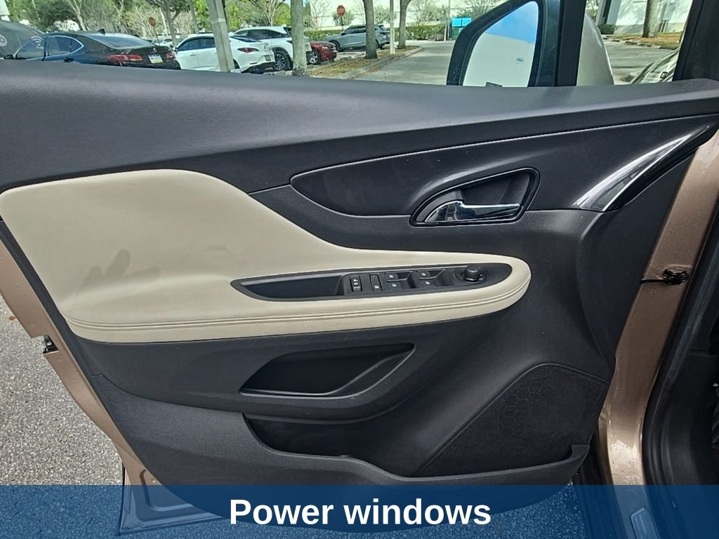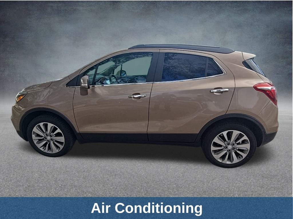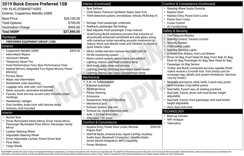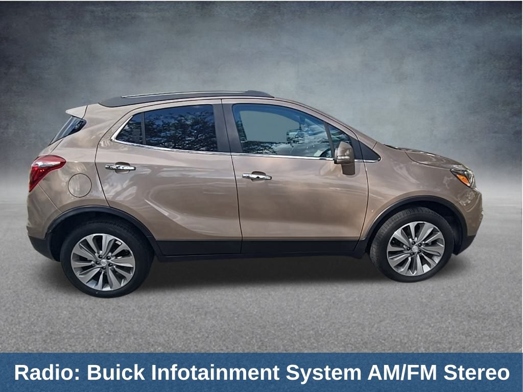 This Encore is well equipped with Preferred Equipment Group 1SB, Encore Preferred, 4D Sport Utility, ECOTEC 1.4L I4 SMPI DOHC Turbocharged VVT, 6-Speed Automatic Electronic with Overdrive, AWD, Coppertino Metallic, Shale Cloth, 2-Way Manual Front Passenger Seat Adjuster, 3.53 Final Drive Axle Ratio, 4-Wheel Disc Brakes, 6 Speakers, 6-Speaker Audio System, 6-Way Power Driver Seat Adjuster, ABS brakes, Air Conditioning, Alloy wheels, AM/FM radio: SiriusXM, Apple CarPlay/Android Auto, Brake assist, Bumpers: body-color, Cloth w/Leatherette Seat Trim, Compass, Delay-off headlights, Driver door bin, Driver vanity mirror, Driver's Seat Mounted Armrest, Dual front impact airbags, Dual front side impact airbags, Electronic Stability Control, Emergency communication system: OnStar and Buick connected services capable, Exterior Parking Camera Rear, Front anti-roll bar, Front Bucket Seats, Front reading lights, Front wheel independent suspension, Fully automatic headlights, Heated door mirrors, Illuminated entry, Knee airbag, Low tire pressure warning, Occupant sensing airbag, Outside temperature display, Overhead airbag, Panic alarm, Passenger door bin, Passenger vanity mirror, Power door mirrors, Power driver seat, Power steering, Power windows, Radio data system, Radio: Buick Infotainment System AM/FM Stereo, Rear seat center armrest, Rear side impact airbag, Rear window defroster, Rear window wiper, Remote keyless entry, Remote Vehicle Starter System, Ride & Handling Suspension, Roof rack: rails only, Security system, SiriusXM Radio, Speed control, Speed-sensing steering, Split folding rear seat, Spoiler, Steering wheel mounted audio controls, Tachometer, Telescoping steering wheel, Tilt steering wheel, Traction control, Trip computer, Turn signal indicator mirrors, Variably intermittent wipers, and Wheels: 18" Machined-Face Alloy. Price does not include $1,199 predelivery service fee, tax, title, or licen