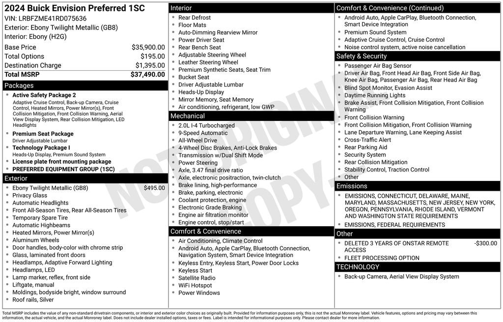Highlighted by its stunning Ebony Twilight Metallic exterior and Black interior, the 2024 Envision Preferred boasts an impressive array of features: