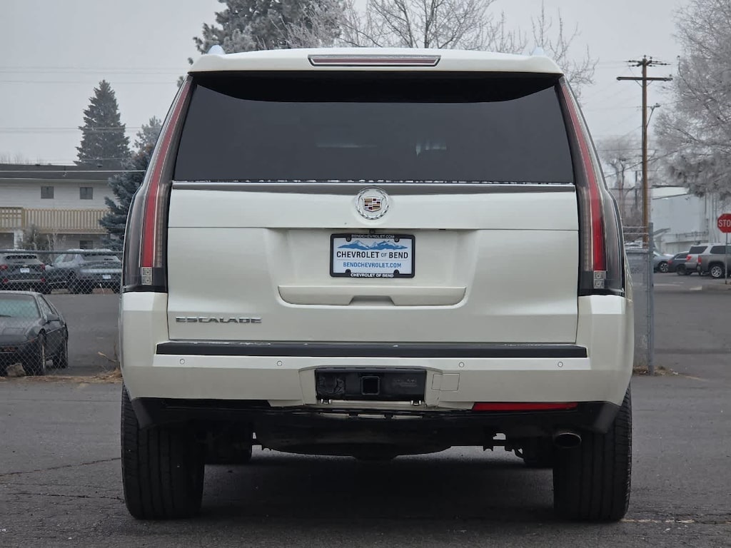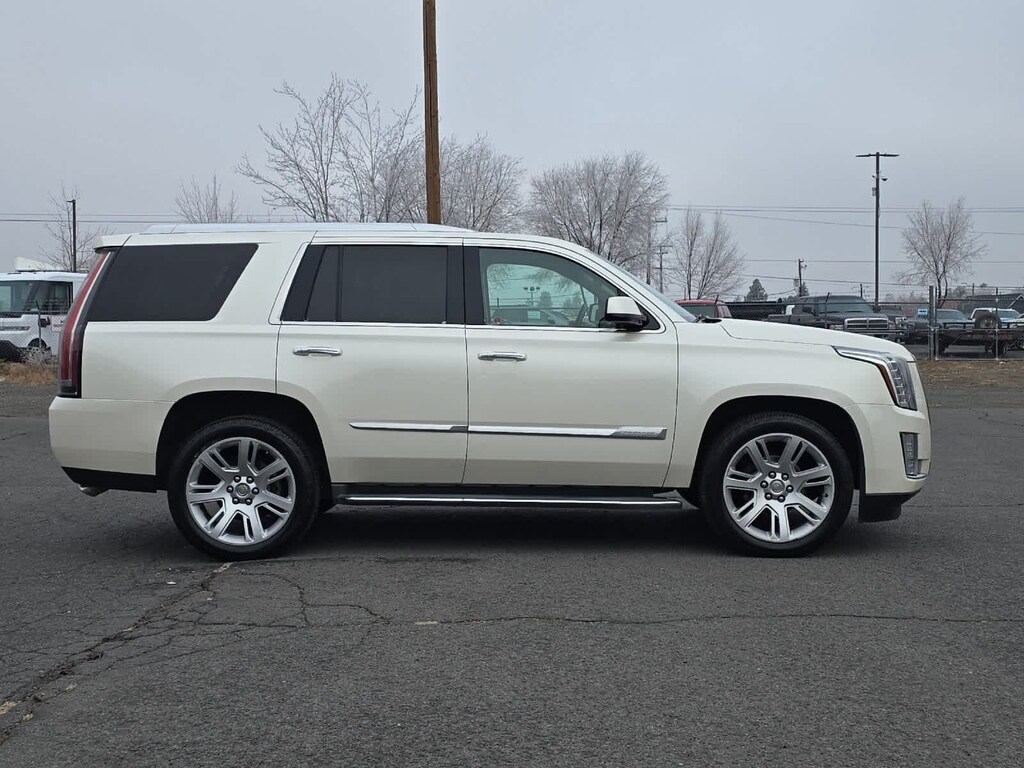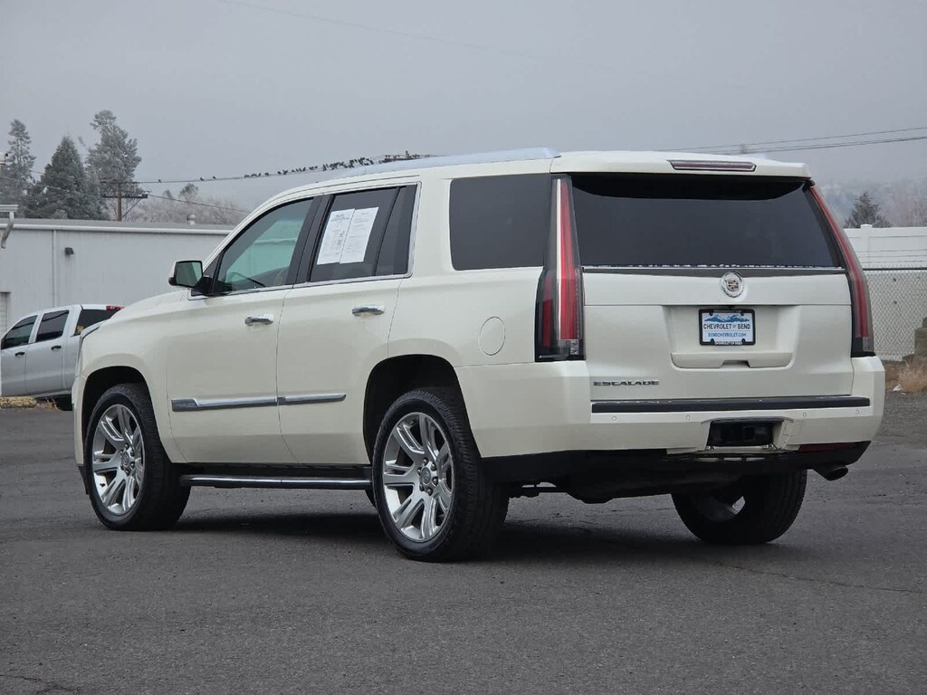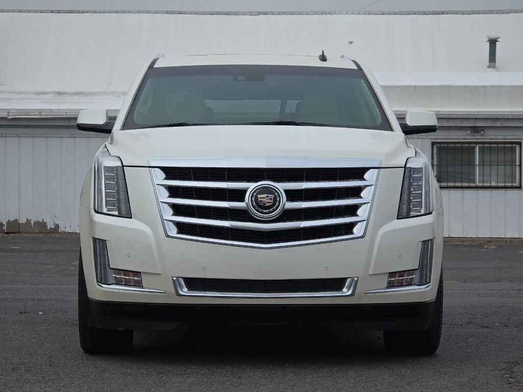 White 2015 Cadillac Escalade Premium 4WD 8-Speed Automatic Vortec 6.2L V8 SIDI 4WD, Shale/Cocoa Accents w/Leather Seating Surfaces, Adaptive Full-Speed Range Cruise Control, Automatic Safety Belt Tightening, Automatic temperature control, Bose Centerpoint Surround Sound System, Driver Assist Package, Driver Awareness Package, Forward Collision Alert, Front & Rear Automatic Braking, Front dual zone A/C, Heated & Cooled Front Bucket Seats, Lane Departure Warning System, Rear Seat Entertainment System, Theft-Deterrent Alarm System, Theft-Deterrent Package, Vehicle Inclination Sensor, Vehicle Interior Movement Sensor.