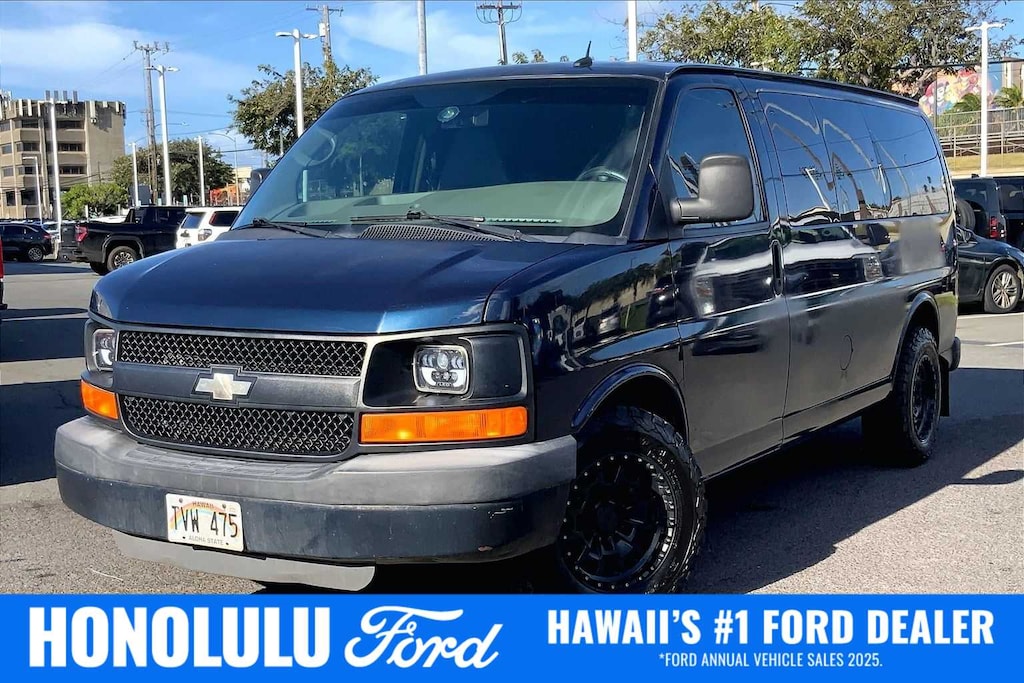 HONOLULU FORD! 808-532-1700, *DONT WAIT! CALL NOW!!, FINANCING AVAILABLE, GUARANTEED APPROVALS! LOW PAYMENTS! GREAT INTEREST RATES!, EXTRA CLEAN, WELL TAKEN CARE OF, EXCELLENT CONDITION!, EXCELLENT SERVICE HISTORY!!, READY FOR YOU TO DRIVE HOME TODAY!, 145 Amp Alternator, 17 x 7 Steel Wheels, 2 Speakers, 3.42 Rear Axle Ratio, 3rd row seats: bench, 4-Wheel Disc Brakes, 8-Passenger Seating (2-3-3 Seating Configuration), 8-Point Digital Compass, ABS brakes, Air Conditioning, AM/FM radio, AM/FM Stereo w/Seek & Scan, Auxiliary Lighting, Convenience Package, Cruise Control, Custom Vinyl Seat Trim, Delay-off headlights, Deluxe Console, Driver & Front Passenger Padded Visors, Driver door bin, Drivers Seat Mounted Armrest, Dual front impact airbags, Electronic Stability Control, Emergency communication system: OnStar Directions & Connections, Front anti-roll bar, Front Bucket Seats, Front Reclining High-Back Bucket Seats, Front wheel independent suspension, Fully automatic headlights, Low tire pressure warning, Overhead airbag, Passenger door bin, Passenger seat mounted armrest, Power Convenience Package, Power Door Locks w/Lock-Out Protection, Power steering, Power Windows, Preferred Equipment Group 1LS, Reading Lights, Rear Air, Rear Auxiliary Heater, Remote Keyless Entry, Tachometer, Tilt Steering Wheel, Traction control, Trip computer, Underhood Lights, Variably intermittent wipers, Voltmeter. Recent Arrival! Dark Blue Metallic 2011 Chevrolet Express 1500 LS Passenger RWD 4-Speed Automatic with Overdrive Vortec 5.3L V8 SFI Flex Fuel