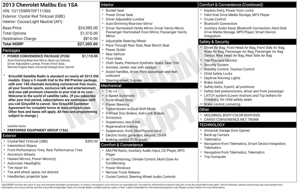 2013 Chevrolet Malibu Eco Is nicely equipped with Power Convenience Package (Body-Color Bodyside Moldings, Driver 8-Way Power Seat Adjuster, Driver Power Lumbar Seat Adjuster, Inside Rear-View Auto-Dimming Mirror, Rear Vision Camera, Remote Vehicle Starter System, Trunk Cargo Convenience Net, and Universal Home Remote), Preferred Equipment Group 1SA, Cocoa/Light Neutral Cloth, 17" 5-Spoke Aluminum Wheels, 4-Wheel Disc Brakes, 6 Speakers, ABS brakes, Air Conditioning, Alloy wheels, AM/FM radio: SiriusXM, AM/FM Stereo w/CD Player & MP3 Playback, Audio System Feature, Automatic temperature control, Brake assist, Bumpers: body-color, CD player, Chevrolet MyLink Touch, Compass, Delay-off headlights, Driver door bin, Driver vanity mirror, Dual front impact airbags, Dual front side impact airbags, Electronic Stability Control, Emergency communication system: OnStar Directions & Connections, Four wheel independent suspension, Front anti-roll bar, Front Bucket Seats, Front Center Armrest w/Storage, Front dual zone A/C, Front reading lights, Fully automatic headlights, Heated door mirrors, Illuminated entry, Knee airbag, Low tire pressure warning, Occupant sensing airbag, Outside temperature display, Overhead airbag, Overhead console, Panic alarm, Passenger door bin, Passenger vanity mirror, Power door mirrors, Power driver seat, Power steering, Power windows, Premium Cloth/Leatherette Seat Trim, Radio data system, Rear anti-roll bar, Rear seat center armrest, Rear window defroster, Remote keyless entry, Security system, SIRIUSXM Satellite Radio, Speed control, Split folding rear seat, Steering wheel mounted audio controls, Tachometer, Telescoping steering wheel, Tilt steering wheel, Traction control, Trip computer, and Variably intermittent wipers.