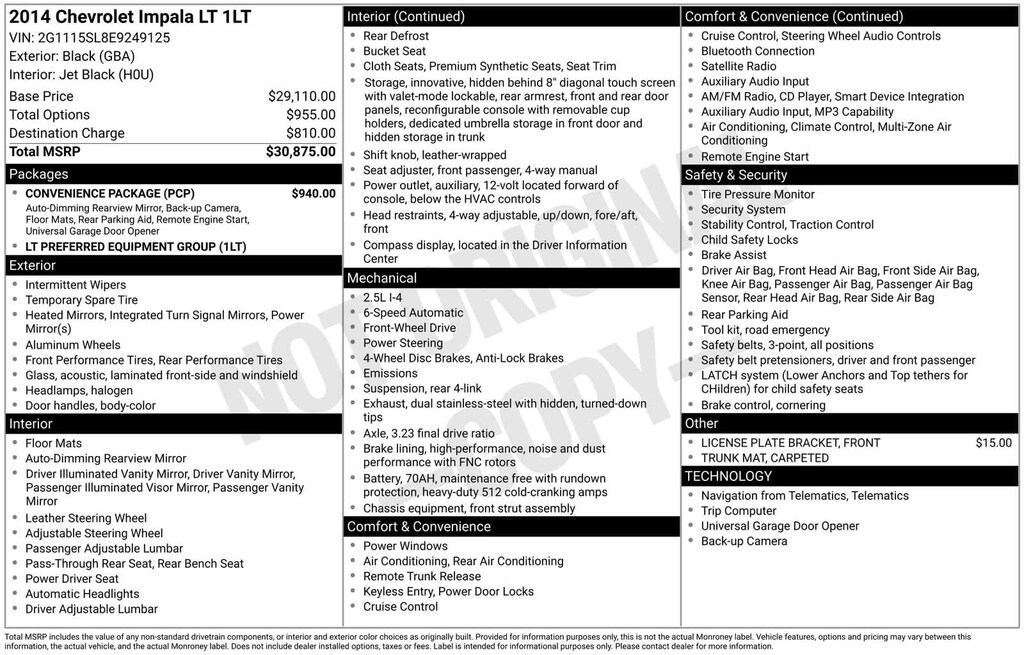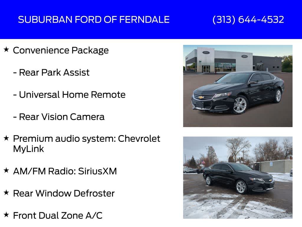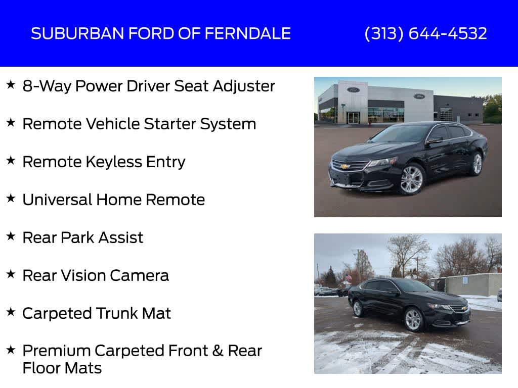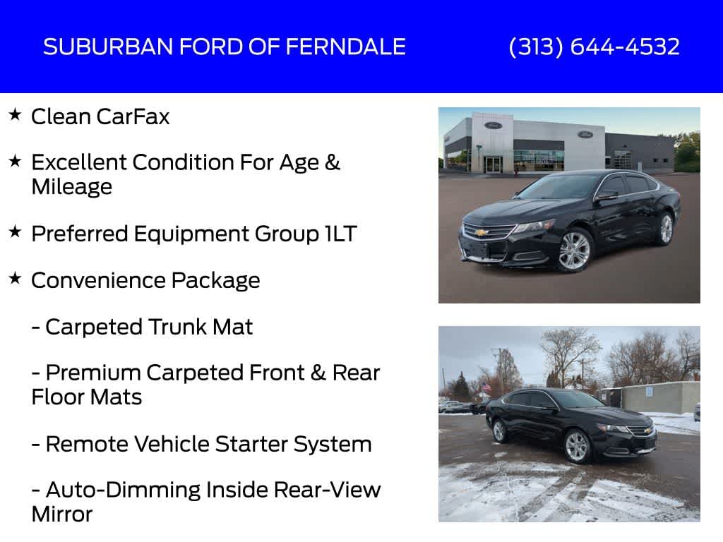 Black 2014 Chevrolet Impala LT 1LT FWD 6-Speed Automatic Electronic with Overdrive ECOTEC 2.5L I4 DGI DOHC Clean CarFax, Excellent Condition For Age & Mileage, 8-Way Power Driver Seat Adjuster, AM/FM Radio: SiriusXM, Auto-Dimming Inside Rear-View Mirror, Automatic Temperature Control, Carpeted Trunk Mat, Convenience Package, Front Dual Zone A/C, Preferred Equipment Group 1LT, Premium audio system: Chevrolet MyLink, Premium Carpeted Front & Rear Floor Mats, Rear Park Assist, Rear Vision Camera, Rear Window Defroster, Remote Keyless Entry, Remote Vehicle Starter System, Universal Home Remote.