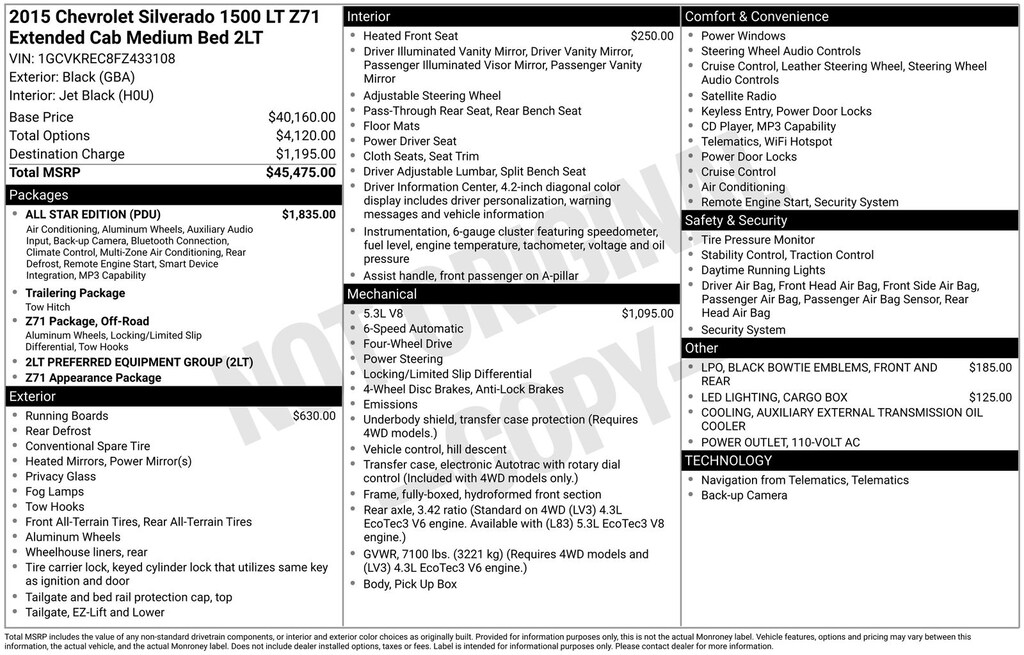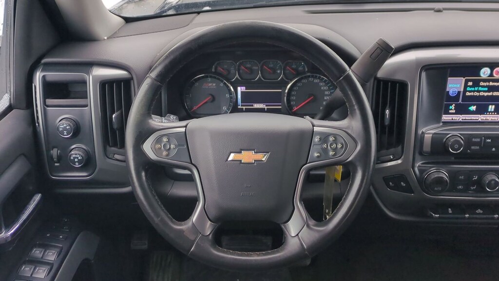 2015 Chevrolet Silverado 1500 LT LT2 Is nicely equipped with All Star Edition (110-Volt AC Power Outlet, Dual-Zone Automatic Climate Control, Electric Rear-Window Defogger, Radio: AM/FM 8" Diagonal Color Touch Screen, Rear Vision Camera w/Dynamic Guide Lines, Remote Vehicle Starter System, Wheels: 18" x 8.5" Bright Machined Aluminum, SiriusXM Satellite Radio, and Theft Deterrent System (Unauthorized Entry)), Trailering Equipment, 6-Speed Automatic Electronic with Overdrive, 4WD, Black Cloth, 10-Way Power Driver's Seat Adjuster, 150 Amp Alternator, 3.42 Rear Axle Ratio, 4-Wheel Disc Brakes, 4.2" Diagonal Color Display Driver Info Center, 4" Round Black Tubular Assist Steps (LPO), 40/20/40 Front Split Bench Seat, 6 Speaker Audio System, 6 Speakers, ABS brakes, Air Conditioning, Alloy wheels, AM/FM radio: SiriusXM, Auxiliary External Transmission Oil Cooler, Bluetooth® For Phone, Body Color Bodyside Moldings, Body Color Door Handles, Body-Color Mirror Caps, Body-Color Power Adjustable Heated Outside Mirrors, Bodyside moldings, Brake assist, Bumpers: chrome, CD player, Cloth Seat Trim, Color-Keyed Carpeting w/Rubberized Vinyl Floor Mats, Compass, Deep-Tinted Glass, Delay-off headlights, Driver & Front Passenger Illuminated Vanity Mirrors, Driver door bin, Driver vanity mirror, Dual front impact airbags, Dual front side impact airbags, Electronic Stability Control, Emergency communication system: OnStar Directions & Connections, EZ Lift & Lower Tailgate, Front & Rear Black Bowtie Emblems (LPO), Front anti-roll bar, Front Center Armrest w/Storage, Front Chrome Bumper, Front Halogen Fog Lamps, Front reading lights, Front wheel independent suspension, Fully automatic headlights, Heated door mirrors, Heated Driver & Front Passenger Seats, Heavy-Duty Rear Locking Differential, Illuminated entry, Leather Wrapped Steering Wheel w/Cruise Controls, LED Cargo Box Lighting, Low tire pressure warning, Manual Tilt Wheel Steering Column, Occupant sensing airbag, OnStar 6 Months Directions & Connections Plan, OnStar w/4G LTE, Outside temperature display, Overhead airbag, Overhead console, Panic alarm, Passenger door bin, Passenger vanity mirror, Power door mirrors, Power steering, Power windows, Power Windows w/Driver Express Up, Premium audio system: Chevrolet MyLink, Radio data system, Radio: AM/FM Audio System w/Chevrolet MyLink, Rear 60/40 Folding Bench Seat (Folds Up), Rear Chrome Bumper, Rear reading lights, Rear step bumper, Rear Wheelhouse Liners, Remote Keyless Entry, Remote keyless entry, Single Slot CD/MP3 Player, Speed control, Speed-sensing steering, Split folding rear seat, Steering Wheel Audio Controls, Steering wheel mounted audio controls, Tachometer, Tilt steering wheel, Traction control, Trip computer, Variably intermittent wipers, Voltmeter, and Wheels: 17" x 8" Bright Machined Aluminum.