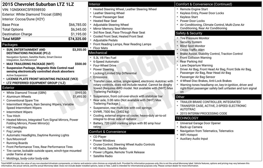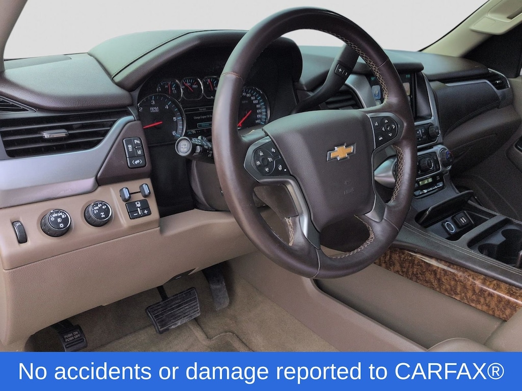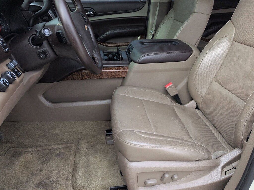 Clean CARFAX. 2015 Chevrolet Suburban LTZ Is nicely equipped with License Plate Front Mounting Package, Magnetic Ride Control Suspension Package, Max Trailering Package (2-Speed Active Electronic AutoTrac Transfer Case, 3.42 Rear Axle Ratio, and Integrated Trailer Brake Controller), Preferred Equipment Group 1LZ (3rd Row 60/40 Power Fold Split-Bench, Auto-Dimming Inside Rear-View Mirror, Color-Keyed Heated Leather-Wrapped Steering Wheel, Driver & Front Passenger Airbags, Floor Console w/Storage Area, Fog Lamps, Forward Collision Alert Sensor Indicator, Front & Rear Parking Assist, Hands Free Power Liftgate, Heated 2nd Row Seats, Heavy-Duty Locking Rear Differential (DISC), Keyless Start Switch, Lane Departure Warning & Safety Alert Seat, Memory Settings, Passive Entry System, Power Folding & Adjustable Heated Outside Mirrors, Power Release 2nd Row Bucket Seats, Power Tilt & Telescoping Steering Column, Power-Adjustable Accelerator & Brake Pedals, Rear Cross-Traffic Alert Sensor Indicator, Side Blind Zone Alert w/Lane Change Alert, Universal Home Remote, and Wireless Charging), Sun, Entertainment & Destinations Package (Power Tilt-Sliding Sunroof w/Express-Open/Close, Rear Seat Entertainment System, and 3rd Row DVD Screen), Wheels: 22" Premium Painted w/Chrome Inserts, 10 Speakers, 3rd row seats: split-bench, 4-Wheel Disc Brakes, ABS brakes, Adaptive suspension, Adjustable pedals, Air Conditioning, Alloy wheels, AM/FM radio: SiriusXM, Auto-dimming door mirrors, Auto-dimming Rear-View mirror, Automatic temperature control, Bodyside moldings, Bose Centerpoint Surround Sound 10-Speaker System, Brake assist, Bumpers: body-color, CD player, Compass, Delay-off headlights, Driver door bin, Driver vanity mirror, Dual front impact airbags, Dual front side impact airbags, Electronic Stability Control, Emergency communication system: OnStar Directions & Connections, Exterior Parking Camera Rear, Front anti-roll bar, Front Bucket Seats, Front Center Armrest, Front dual zone A/C, Front fog lights, Front reading lights, Front Reclining Bucket Seats, Front wheel independent suspension, Fully automatic headlights, Garage door transmitter, Headphones, Heated & Cooled Driver & Front Passenger Seats, Heated door mirrors, Heated front seats, Heated rear seats, Heated steering wheel, High-Intensity Discharge Headlights, Illuminated entry, Leather Shift Knob, Low tire pressure warning, Memory seat, Navigation System, Occupant sensing airbag, OnStar w/4G LTE, Outside temperature display, Overhead airbag, Overhead console, Panic alarm, Passenger door bin, Passenger vanity mirror, Pedal memory, Perforated Leather-Appointed Seat Trim, Power door mirrors, Power driver seat, Power Liftgate, Power passenger seat, Power steering, Power windows, Radio: Chevrolet MyLink w/Navigation/AM/FM Stereo, Rain sensing wipers, Rear air conditioning, Rear anti-roll bar, Rear audio controls, Rear reading lights, Rear window defroster, Rear window wiper, Remote keyless entry, Roof rack: rails only, Security system, Single-Slot CD/MP3 Player, SiriusXM Satellite & HD Radio, Speed control, Speed-sensing steering, Split folding rear seat, Spoiler, Steering wheel memory, Steering wheel mounted audio controls, Tachometer, Telescoping steering wheel, Tilt steering wheel, Traction control, Trip computer, Turn signal indicator mirrors, Variably intermittent wipers, Ventilated front seats, Voltmeter, and Wheels: 20" x 9" Polished-Aluminum.