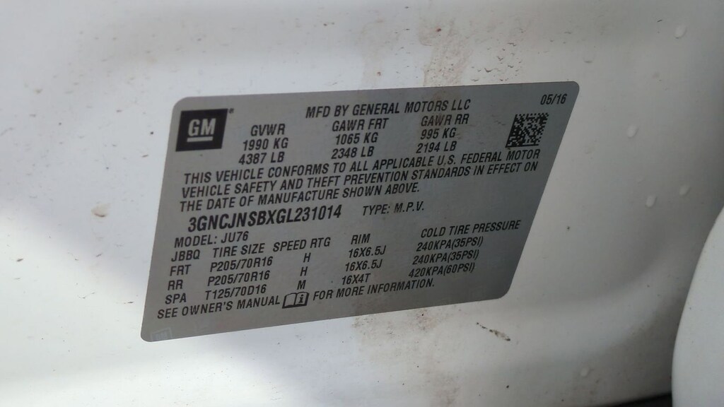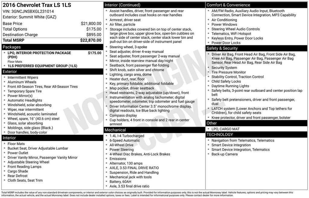 2016 Chevrolet Trax LS Is nicely equipped with Interior Protection Package (LPO) (Cargo Mat and Front & Rear All Weather Floor Mats (LPO)), 16" Painted Aluminum Wheels, 2-Way Manual Front Passenger Seat Adjuster, 3.53 Final Drive Axle Ratio, 4-Way Manual Driver Seat Adjuster, 4-Wheel Disc Brakes, 6 Speakers, 6-Speaker Audio System Feature, ABS brakes, Air Conditioning, All-Wheel Drive Chassis, Alloy wheels, AM/FM radio, Brake assist, Bumpers: body-color, Cloth Seat Trim, Compass, Delay-off headlights, Driver door bin, Driver vanity mirror, Driver's Seat Mounted Armrest, Dual front impact airbags, Dual front side impact airbags, Electronic Stability Control, Emergency communication system: OnStar Guidance, Exterior Parking Camera Rear, Front anti-roll bar, Front Bucket Seats, Front Bucket Seats w/Driver Power Lumbar, Front reading lights, Front wheel independent suspension, Fully automatic headlights, Illuminated entry, Knee airbag, Low tire pressure warning, Occupant sensing airbag, Outside temperature display, Overhead airbag, Panic alarm, Passenger door bin, Passenger vanity mirror, Power door mirrors, Power steering, Power windows, Premium audio system: Chevrolet MyLink, Radio data system, Radio: Chevrolet MyLink AM/FM Stereo, Rear seat center armrest, Rear side impact airbag, Rear window defroster, Rear window wiper, Remote keyless entry, Security system, Speed-sensing steering, Split folding rear seat, Spoiler, Steering wheel mounted audio controls, Tachometer, Telescoping steering wheel, Tilt steering wheel, Traction control, Trip computer, and Variably intermittent wipers.